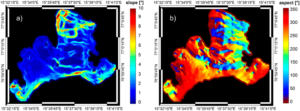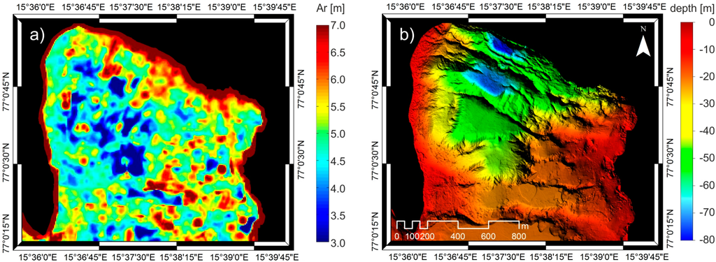Figure 6 shows values of the autocorrelation length calculated from the input data with a resolution of d = 0.5 m. In the northern part of the study area, local basins filled with sediments are located in the closest proximity of the glacier terminus (B in Figure 1C). Their surface is covered with minor roughness and linear artefacts resulting from measurement errors, and the autocorrelation length has low values. Elevations of recessional moraines occur between sedimentary basins. Their surface is smoother compared to the fjord’s bottom covered with artefacts and small roughness, hence long autocorrelation length was determined here (Figure 8a,b).