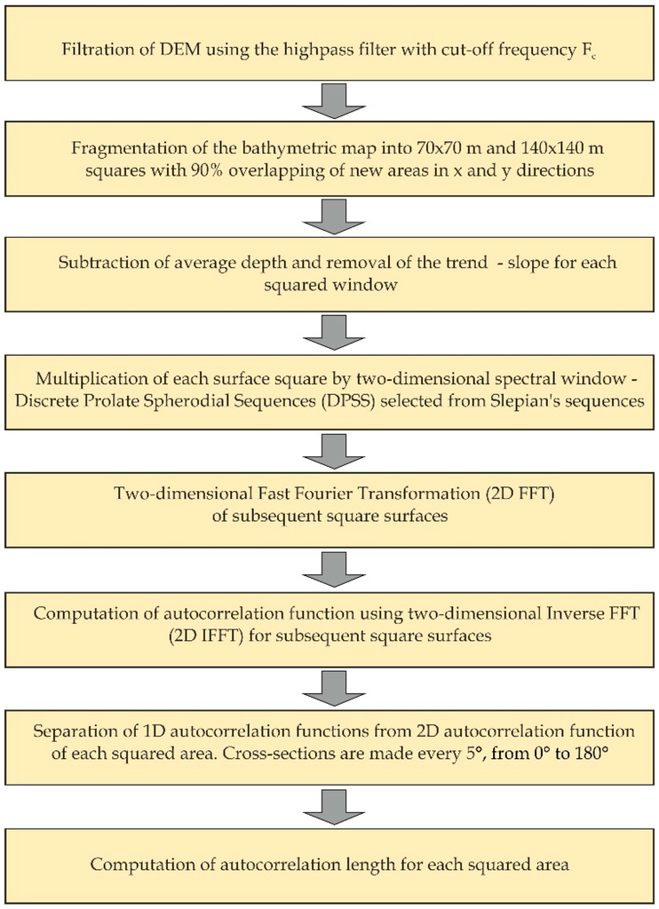 The fast Fourier transform and the Wiener–Khinchin theorem were used to significantly advance the computational efficiency, since the calculation of the autocorrelation directly from its definition requires large computational power and significantly increases the computation time due to the large number of bathymetric data that results from the high spatial resolution of DEM (0.5 m) and the overlap between two successive sliding windows is 90%. Although the Wiener–Khinchin theorem has been known for several decades, it has not been used previously in the calculation of rough surface autocorrelation of the bottom. Such a calculation method provides a high resolution distribution map of the autocorrelation length.