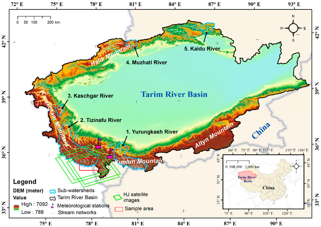 Elevation map of the Tarim River Basin and environs showing the locations of the key subwatersheds, sample area, meteorological stations, and coverage of HJ-1A/B satellite images.