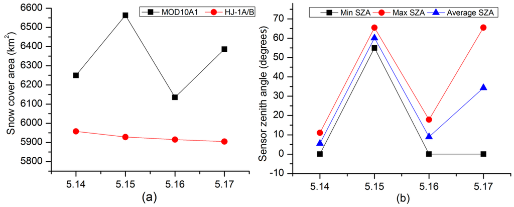 Changes in: (a) snow cover area calculated from MOD10A1 and HJ-1A/B data; and (b) the sensor zenith angle (SZA) value in a typical area of the Tarim River Basin on 14–17 May 2011.