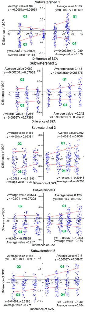 All the scatter plots contain groups of points that are aligned in columns at distinctly different distances along the abscissa. This is because of the change in the value of the SZA at the same location (i.e., the same pixel in the MOD10A1 data), which is related to the variation in the satellite’s orbital pattern. However, the SZA difference between two consecutive days was fixed, and therefore, the pixels in the same subwatershed were aligned by the same process that formulated the columns described above. The spatial areas of the different subwatersheds and the locations of areas where snowfall frequently occurred both affect the distance between these columns and their widths. Nonetheless, the point distributions observed still indicate a positive correlation between the SZA and SCP differences in all five subwatersheds. These experimental results, obtained from a large number of statistical data, adequately confirmed that a large value of SZA significantly affects the SCA estimation.