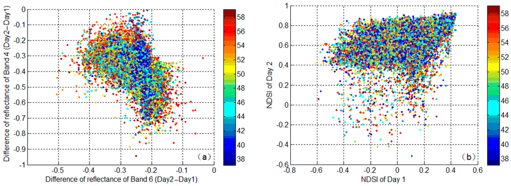 Scatter plots of: (a) the reflectance difference between 15 August 2004 (Day 2), and 14 August 2004 (Day 1), at Band 4 versus that at Band 6 for increased sensor zenith angle (SZA); and (b) the normalized difference snow index (NDSI) value in overestimated snow cover area (SCA) on Day 2 versus that on Day 1 for increased SZA. The color bar indicates the corresponding increase of the SZA value on the overestimated snow cover pixels.