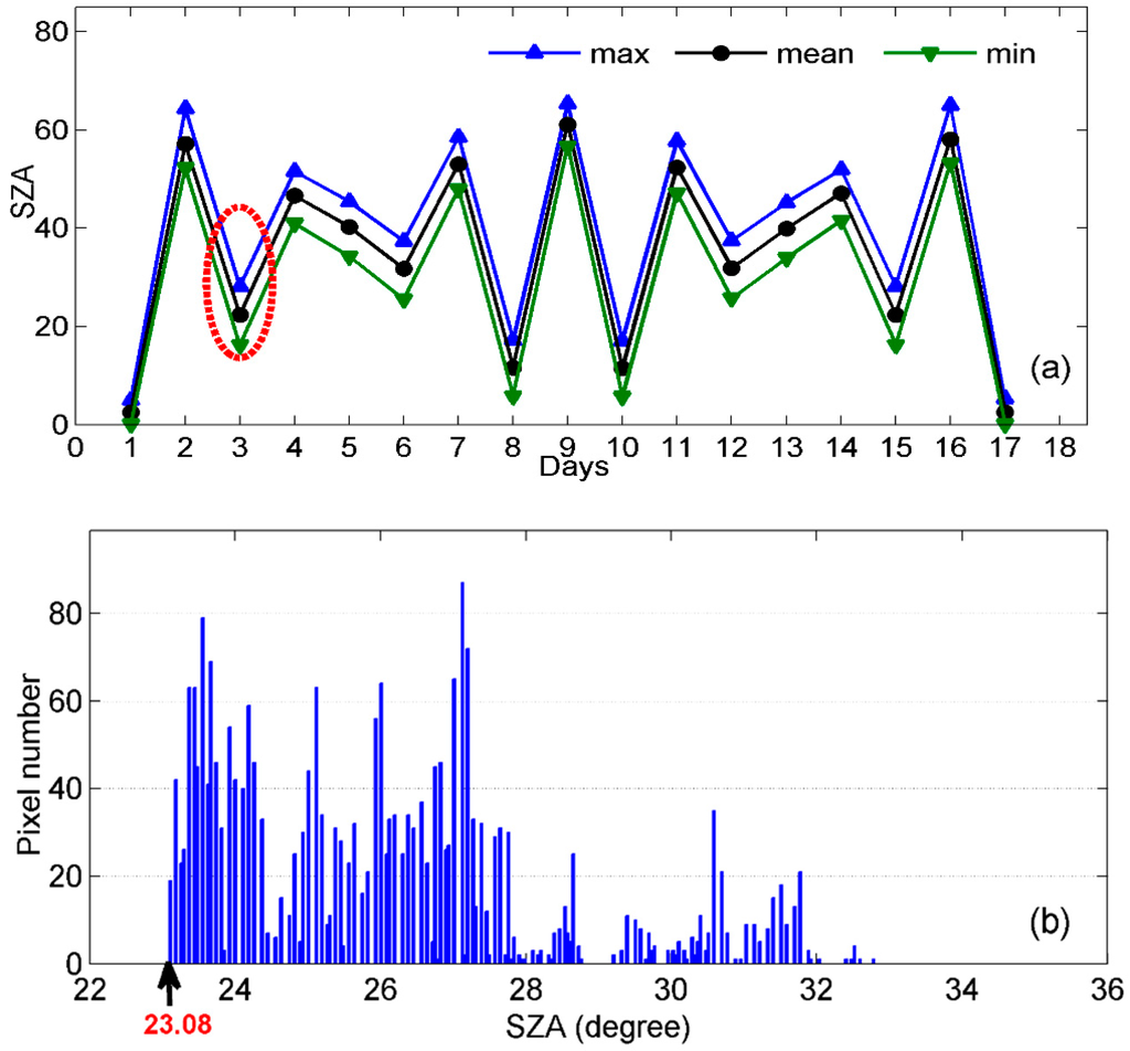 (a) Sensor zenith angle (SZA) changes over the analyzed 17-day period; and (b) a histogram of possible SZA thresholds obtained for one example test period.