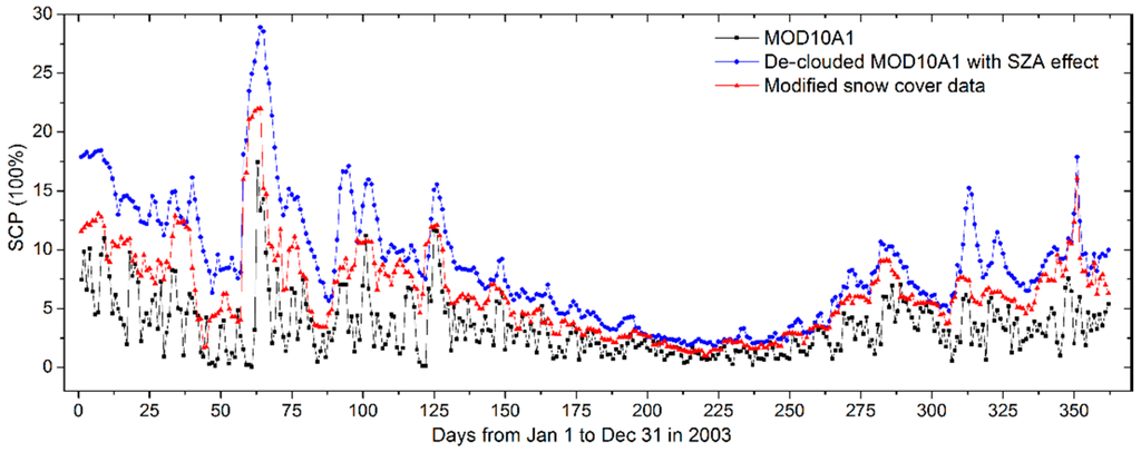 Comparison of the snow cover percentage (SCP) values from the MOD10A1, de-clouded MOD10A1 with sensor zenith angle (SZA) effect, and modified snow cover data for each day in 2003.