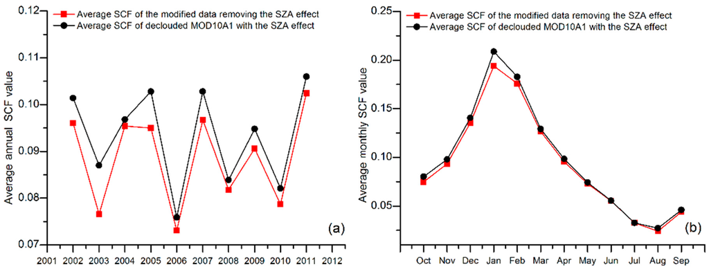 The SCF data for the 10 years between 2002 and 2011 were also used to evaluate the SZA effect. Figure 9a shows the annual average SCF values in the Tarim River Basin (2002–2011) before and after removing pixels with SZA values larger than the threshold value. The SCF is defined as the number of times that a MODIS pixel is classified as snow covered relative to the total number of valid observations obtained during a certain period [33]; thus, it is a spatiotemporal measure of snow cover distribution. These data show that the average SCF of the modified snow cover data decreased relative to that for the average de-clouded MOD10A1 SCF data over this 10-year period. The maximum difference between the average SCF values was a decrease from 0.087 to 0.076 in 2003, which was a relative change of 12.6%, whereas even the minimum change of SCF in 2004 had a relative change of 1.5%. The average decrease was 5.4%. The average SCF values for the same month in each of the 10 years are shown in Figure 9b, which shows that the monthly SCF difference has a clear seasonal pattern. The SZA effect during periods without snow melting was larger than that during snow-melting periods, with a maximum relative difference of 7.6% in January. Even in April—the snow-melting period—there was a non-negligible difference of 3.03%. The only month that exhibited no difference was July, which also indicated that our results are real and meaningful. The monthly decrease in the average SCF values reached 4.3%, which approached the results obtained for the annual decrease.
