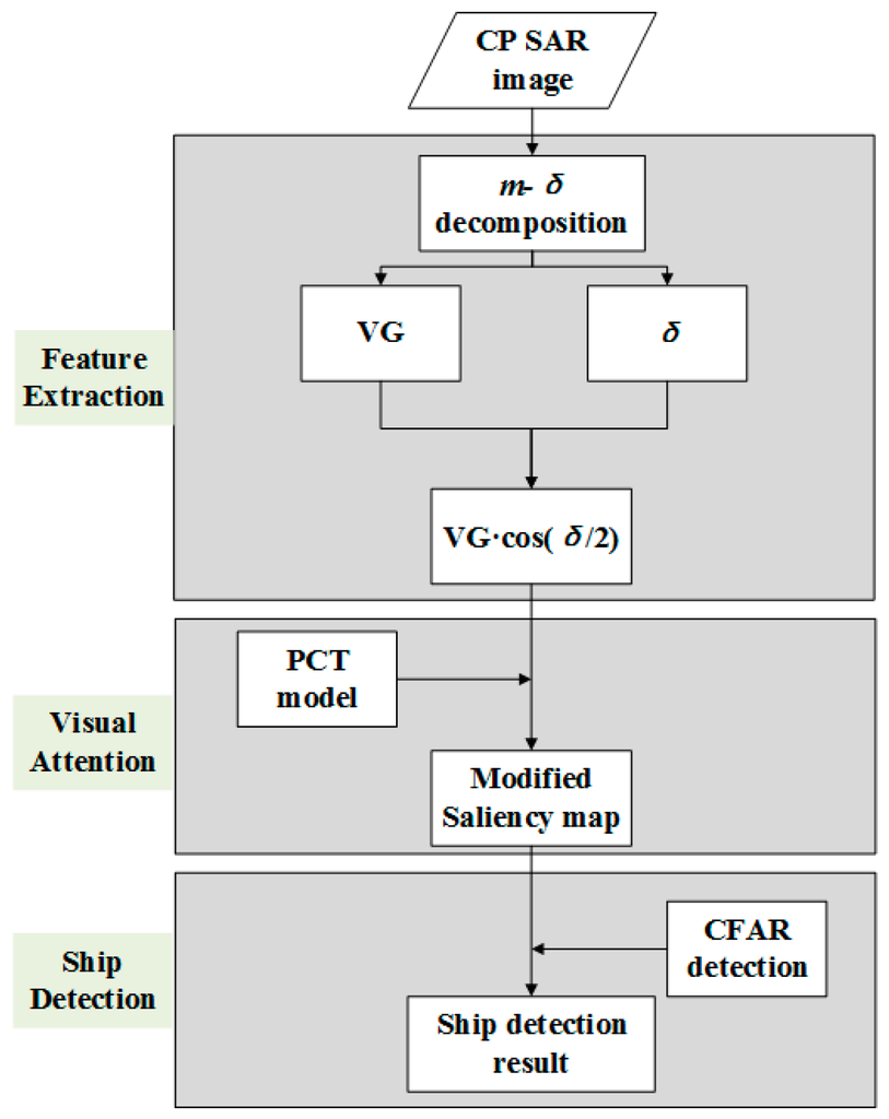 A phenomenon has been noted wherein some ship targets might be missed when the intensity of background clutter is as strong as that of targets. This is caused by the complexity of the imaging procedure and the randomness of ocean states, which is common in high-resolution polarimetric SAR images. However, these undetected ships might still be distinguishable by manual interpretation [31], thanks to the visual attention mechanism in the human brain. The basic idea of visual attention is to inhibit the homogeneous background or identical areas while highlighting the distinctive objects through a “center-surround” mechanism [32]. Because ships are usually distinctive over the homogeneous sea surface, the visual attention concept is suitable for SAR ship detection. This paper introduces visual attention to CP SAR ship detection with the pulsed cosine transform (PCT) model [33], which has been proven feasible for SAR image processing on single-pol images [34,35,36].