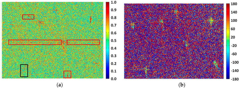 We apply a 3 × 3 boxcar filter to ERH and ERV to spatially average the Stokes vector gCTLR according to Equation (5). Then the degree of polarization and relative phase are calculated as the foundations of m-δ decomposition. The degree of polarization denotes the state of polarization of an electromagnetic filed. Mathematically, the total polarized state corresponds to a point on the Poincaré sphere. There is m = 1 for a totally polarized reflected electromagnetic wave and m = 0 for a totally depolarized reflection wave. In our experimental image, as Figure 3a displays, some ships display a high degree of polarization, but the ship marked by a black rectangle in the left-bottom corner is completely indiscernible. Meanwhile, false alarms caused by azimuth ambiguity, system noise, and side lobes also have high degree of polarization, as marked by red rectangles. As a result, the degree of polarization is inappropriate for ship discrimination as indicated by our experimental area.