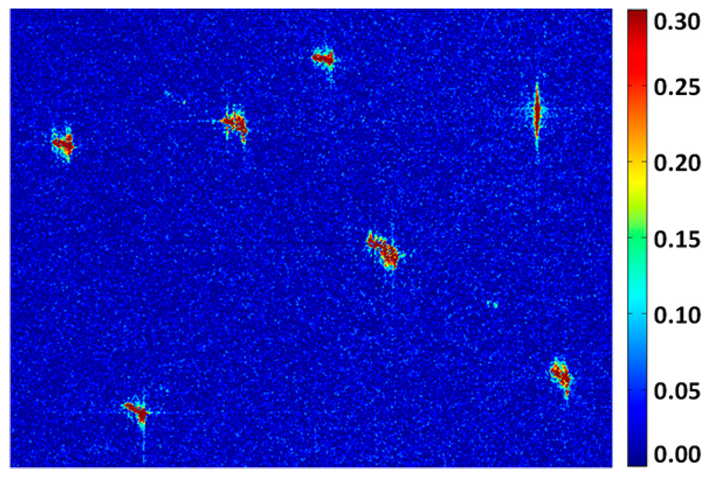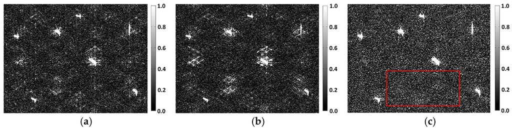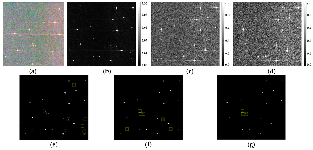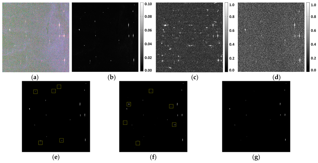 Figure 5 displays the results of m-δ decomposition, where red rectangles represent potential false alarms that perform diversely in different scattering mechanisms. Figure 5a shows the false color composition image of three components. False alarms are conspicuous in Figure 5a because it contains the summed energies of three components. Figure 5b–d denotes three individual scattering mechanisms, of which the color bars represent the intensity of three decomposition components. It is obvious that side lobes are most severe in the surface scattering component, whereas azimuth ambiguities are distinguishable in all components. However, the volume scattering component shows some superiority in inhibiting disturbances: the side lobes are weaker; and strong system noises presented at the bottom of other images do not show up.