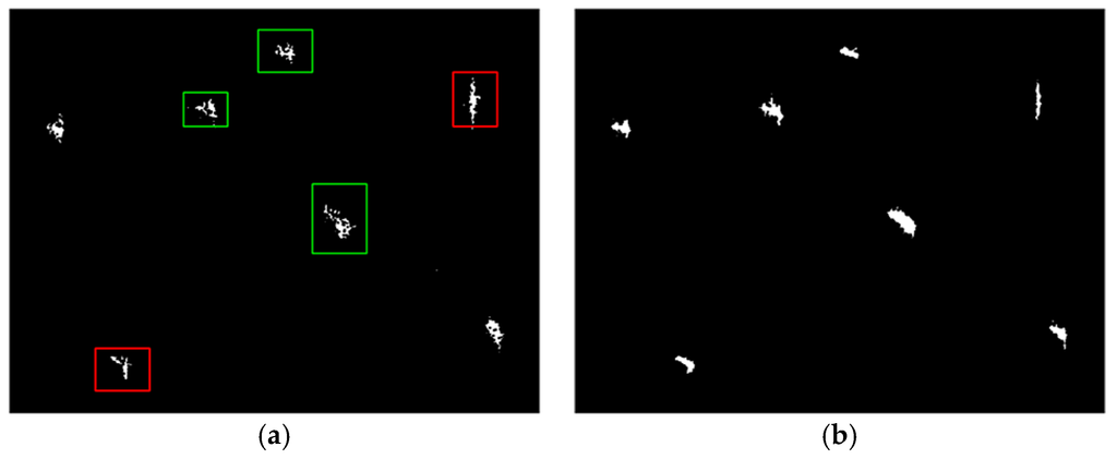 The differences between Figure 9a,b concern three aspects: (1) without visual attention enhancement, the combined feature I lacks the ability of maintaining shape integrities; (2) for ships marked by green rectangles, some inside structures are labeled as background, leading to poor target compactness; (3) the impact of side lobes are not eliminated well, as indicated by ships in red rectangles. These disadvantages make the combined feature I easy to miss ships, especially for small ships or in more complex sea conditions. On contrast, after applying visual attention mode, the completeness of each ship has been strengthened. So it could be concluded that weak targets would benefit a lot from visual attention process, thereby promoting the overall detection performance.