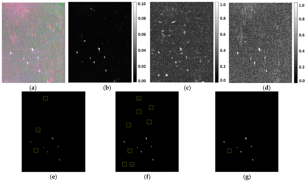 Obviously, the proposed method has the highest FoM, whereas the saliency using only amplitude has the lowest one. This indicates that it is insufficient to discriminate ships from disturbances in complex sea conditions using only amplitude information. Although it achieves relatively high detection rates, it lacks the ability to eliminate false alarms because some disturbances might also be strengthened by visual attention model, especially for azimuth ambiguities. The SPAN method performs better than amplitude saliency because it sums up the total power from both polarizations, and the power contrast between ships and sea surface is the foundation of separating them apart. However, sometimes the scattering power of false alarms is as strong as that of ships, which also results in misidentifications. In contrast, the proposed method involves more polarimetric information to achieve better target significance. It has the highest detection rates and the lowest misidentification rates, leading to the highest FoMs, which are increased by 10.89%, 15.79%, and 11.28% compared with the SPAN method and 39.42%, 53.84%, and 13.76% compared with the RH amplitude saliency method. Although the time consumptions are slightly higher because of the large image sizes, they are still tolerable in realistic applications.