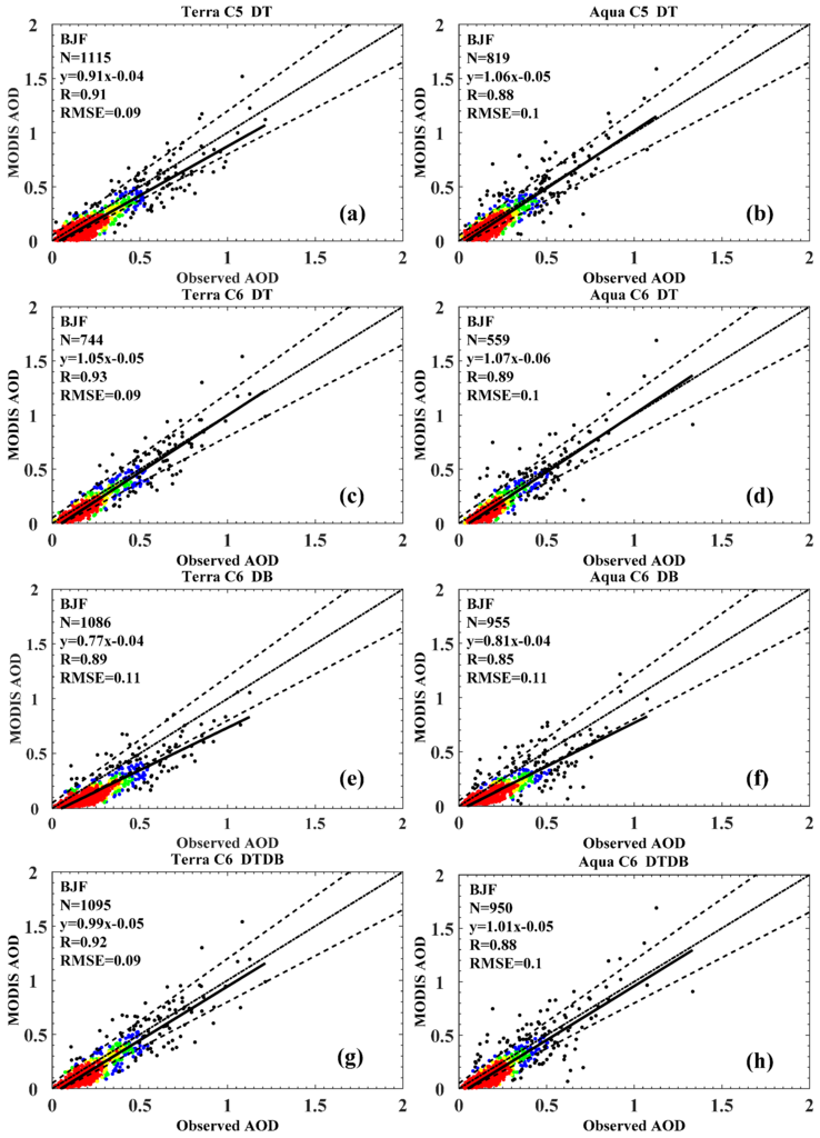 Figure 6a–h showed the validation of C5 and C6 daily AOD versus ground-observed AOD at BJC site. The collected C5 and C6 DT retrievals were mainly in the range of 0~0.3 and 0~0.2, whereas those of C6 DB and C6 DTDB retrievals were in a wider range of 0~0.4, because DT algorithm was partly unavailable over complex and brighter urban surfaces as well as high aerosol loading conditions [16,29]. The overestimation of DT retrievals was obvious, with the large intercept of 0.10~0.19, large RMSE of 0.23~0.28, and more than 52%~68% of DT retrievals falling above EE, which was mainly due to the bias in surface reflectivity estimation. For Terra satellite, the matchups of C6 DT remarkably decreased by 39% comparing to C5 DT, and the intercept increased from 0.10 to 0.19, with RMSE increasing from 0.23 to 0.28, and the data falling above EE increased from 52% to 63%; therefore, the accuracy of C6 DT did not improve as expected, as shown in Figure 6i. For Aqua satellite, when compared to C5 DT, C6 DT matchups decreased by 22%, the slope decreased from 1.07 to 0.95, RMSE decreased from 0.30 to 0.26, with the data falling above EE decreasing from 68% to 60%, and the slightly improvement of C6 DT algorithm was still attractive, further illustrated by the large disparity between the two datasets in Figure 6j. Completely different from the poor performance at BJF, C6 DB algorithm has found to be in a good agreement with ground-observed AOD at BJC, the slope were 0.97 and 0.99, with intercepts of only 0.01, and the percentages within EE were up to 69% and 72% for Terra and Aqua, respectively. As expected, C6 DTDB had sufficient matchups of more than 1500, and it had a good accuracy due to the attendance of 47% of C6 DB retrievals, but the uncertainty of surface reflectivity estimation cannot be ignored, accompanied by intercepts of 0.10, and large RMSEs of 0.23 and 0.22 for Terra and Aqua, respectively. It is worth noting that the RMSE at BJC was in the range 0.17~0.30, whereas the biggest RMSE at BJF was 0.11, which may be related to the various aerosol types and complex urban surface at BJC.