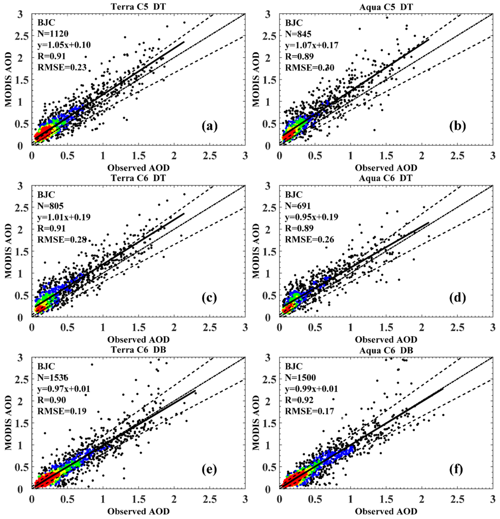 Here, the BJF and BJC sites of CSHNET represented the background and urban areas, respectively. The ground-based daily AOD were from the observations between 10:00 a.m. and 2:00 p.m., the corresponding MODIS retrievals have been averaged in a box of 50 km × 50 km with ground-based stations in the middle [25,35]. In the background area, DT products usually had a better performance due to the algorithm limitation on dark/vegetated surface [15]. Although C6 DB products had expanded coverage to all snow-free and ice-free land [20], there was still a considerable 52% underestimation in our study, caused by biases in aerosol model assumptions, and the results was largely different from the hypotheses of Sayer et al. [21]. In the urban area, DT products had an overestimation of 52%~68% falling above EE, with a large intercept of 0.10~0.19, thus they worked poorly on brighter urban surfaces [16,31]. DB products had more sufficient data records and a good agreement with ground observations, which is also indicated by Tao et al. [29]. Although the improvements from C5 DT to C6 DT products have been identified by many researchers [17,21], the C6 DT level of agreement with CSHNET data has not obviously enhanced here, despite the matchups decreased by approximately 32%~39% compared to C5 DT, that may due to the QA = 3 cases revision in C6 products [17]. Significantly, the new dataset named C6 DTDB has good performance, especially in background, as expected [17,22], but there were little overestimation in the urban. Since the long-term MODIS AOD records are very valuable, they deserve to be updated and adjusted to further decrease the uncertainties.