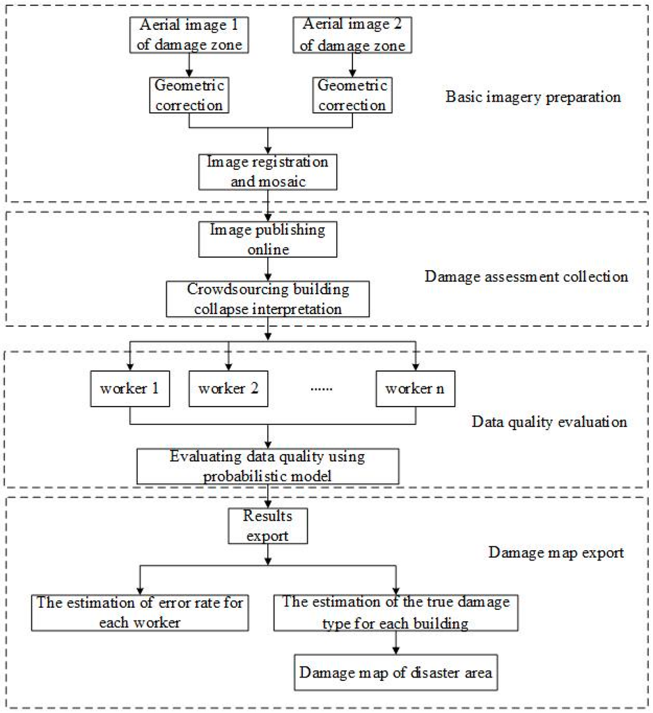 Building damage assessment in the early time after an earthquake is a very crucial problem. Knowing where the collapsed buildings are and to what extent buildings have been damaged are closely related to life-saving for emergency response. However, it is hard to survey the whole in-situ information in a short time after an earthquake. Satellite or aerial remote sensing technology has the capability of earth observation, and becomes a useful tool for damage estimation without being physically present in disaster area. Aerial remote sensing images, which are captured and processed faster and have higher spatial resolution, make it possible to rapidly assess collapsed buildings early after the earthquake. A web-based interface was built. Anyone who accessed our website was required to assign one of the three damage types for each buildings based on the aerial image. The 3456 data points from 27 participants on the experimental area, which is a sub-region of Yushu, were collected. MLE, Bayes’ theorem and EM algorithm were applied to estimate the individual error-rates and infer “ground truth” according to the 3456 data points of 27 participants. The results suggest that EM algorithm is better than “majority” method and there is no clear bias towards extreme value among damage types contributed by participants. This study shows that the variation of image understanding among participants exists, due to their different professional background. We demonstrated how to collect and store the data created by individuals online, how to make them contribute their results flexibly and easily, drawing a point instead of a polygon, and how to quantitatively estimate individuals’ accuracy and the “ground truth” of each building, using a probabilistic model. By means of a sequential procedure of RS image pre-processing, publishing RS image online, collecting crowdsourcing building damage assessment data, evaluating the quality of data contributed by crowdsourcing and damage mapping, the building collapse can be rapidly assessed with viable accuracies in the early time after the earthquake. We conclude that RS data combined with crowdsourcing have a high capability to support large-area assessments of building collapse, meeting the need of disaster emergency response. A new processing framework is proposed to establish the connection between remote sensing image and crowdsourcing, demonstrating potential for crowdsourcing rapid assessment of building collapse early after the earthquake based on aerial remote sensing image. Future efforts will focus on providing multi-source and multi-temporal remote sensing image. Multi-source RS data, such as oblique images, can provide more views of buildings on the ground. Multi-temporal RS data, such as pre-earthquake images, are considered to be very useful as a reference in identifying the damage in the post-event image [4]. Although these adjustments will refine the final results towards rapid damage assessment, a problem should be considered: how to balance the operational complexity of system and the improvement of results, because ordinary people are more inclined to use easy-to-operate systems without spending too much time. In summary, the aim is that the rapid assessment results through crowdsourcing could meet the needs of deploying rescue forces in the early time after the earthquake. More details about the damage level of buildings surveyed on the spot afterwards are beyond the scope of this paper.