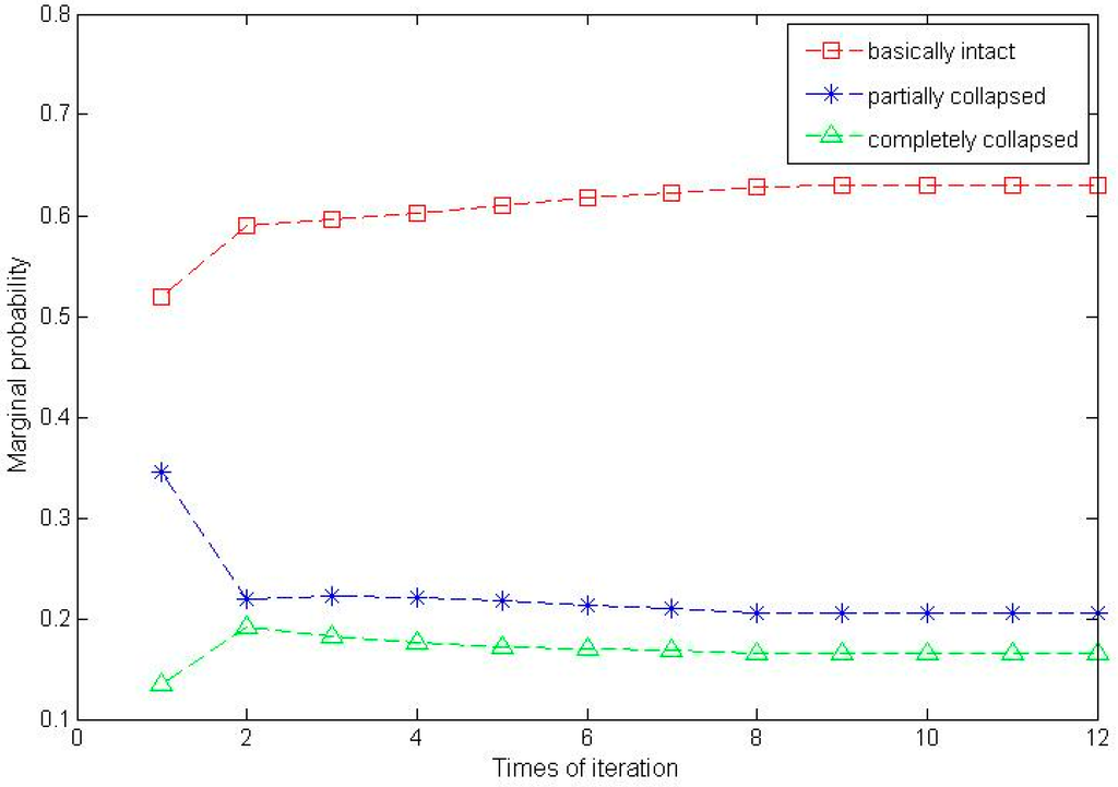 The red, blue and green lines demonstrate the fluctuation of marginal probability of “basically intact”, “partially collapsed” and “completely collapsed”, respectively, with the increase of the number of iterations. When the number of iterations reaches 12, EM algorithm converges.