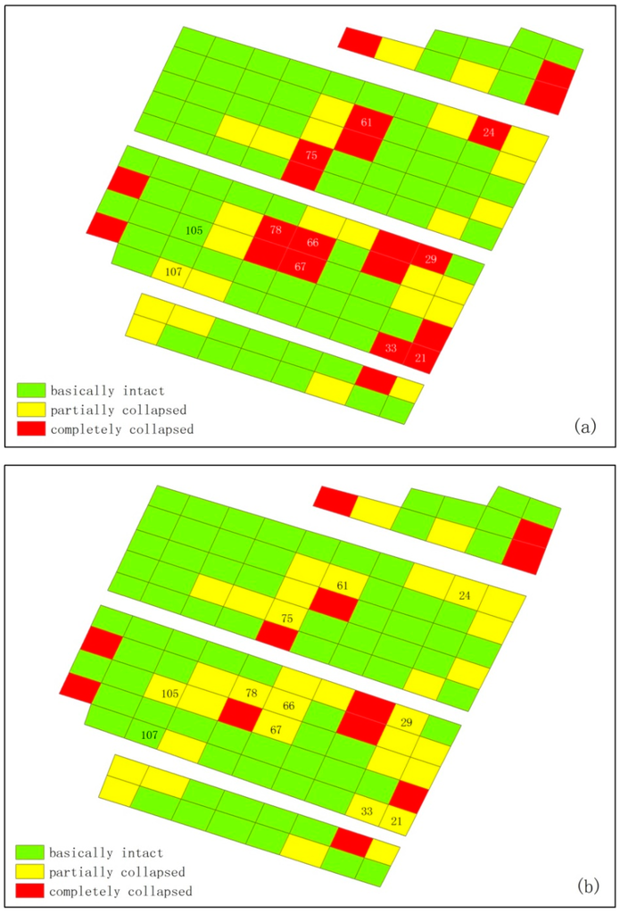 Comparison of the results between the two different methods: (a) the result of EM algorithm; and (b) the result of “majority” method, which are generated with individual buildings rendered with colors representing the type of damage. The rectangles represent the buildings, and green, yellow and red indicate “basically intact”, “partially collapsed” and “completely collapsed”, respectively. The rectangles with the id number on them have the different results between the two methods.