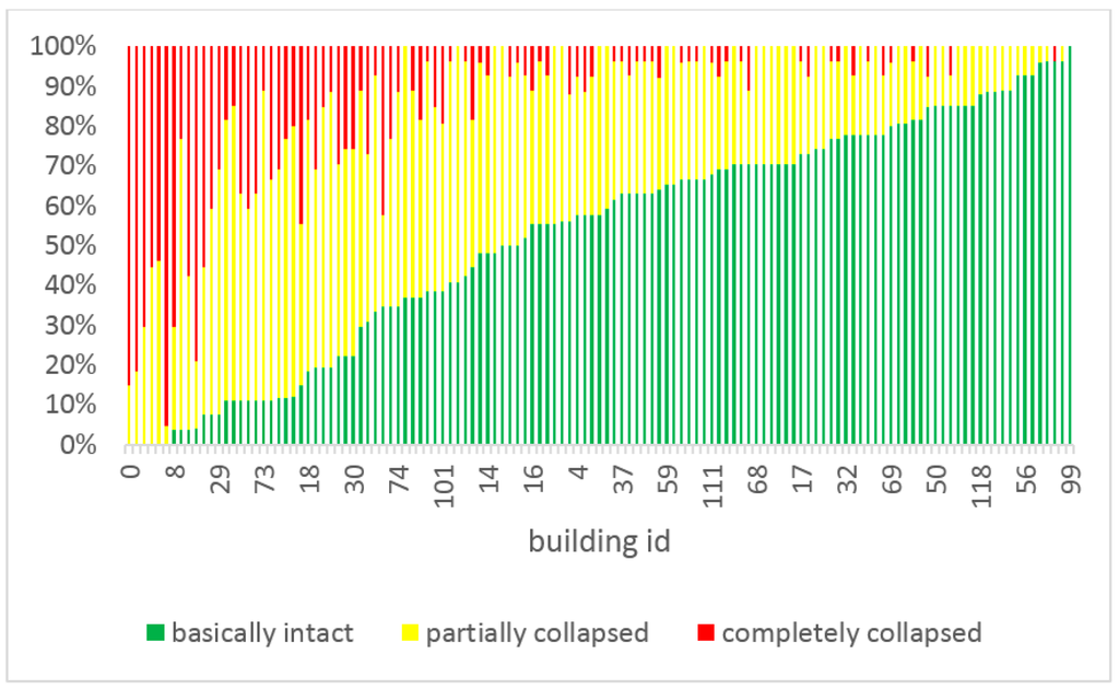 The percentage of each damage type on each building. The green, yellow and red bars represent the percentage of “basically intact”, “partially collapsed” and “completely collapsed”, respectively, on each building. The building ids depicted by X-axis are in ascending order according to the percentage of “basically intact” on each building.