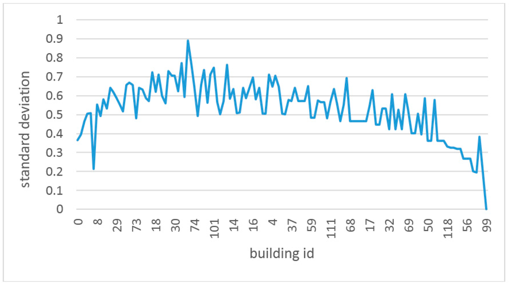 To demonstrate the variation distribution of assessment results that participants give on each building, the percentage of each damage type on each building is presented in Figure 7, in which the building ids are sorted by the percentage of “basically intact” from small to large. Besides, the standard deviation of participants’ assessment results on each building is shown in Figure 8. No clear agreement between participants on each building apart from the No. 99 that all participants label as “basically intact”. This is because participants with different professional background have different cognition, or due to the limitation of image inherent characteristics such as spatial resolution and angle of view. Whatever limitations the professional faces naturally also apply to volunteers [20]. However, no obvious bias towards extreme value indicates that a majority of participants worked without malice.