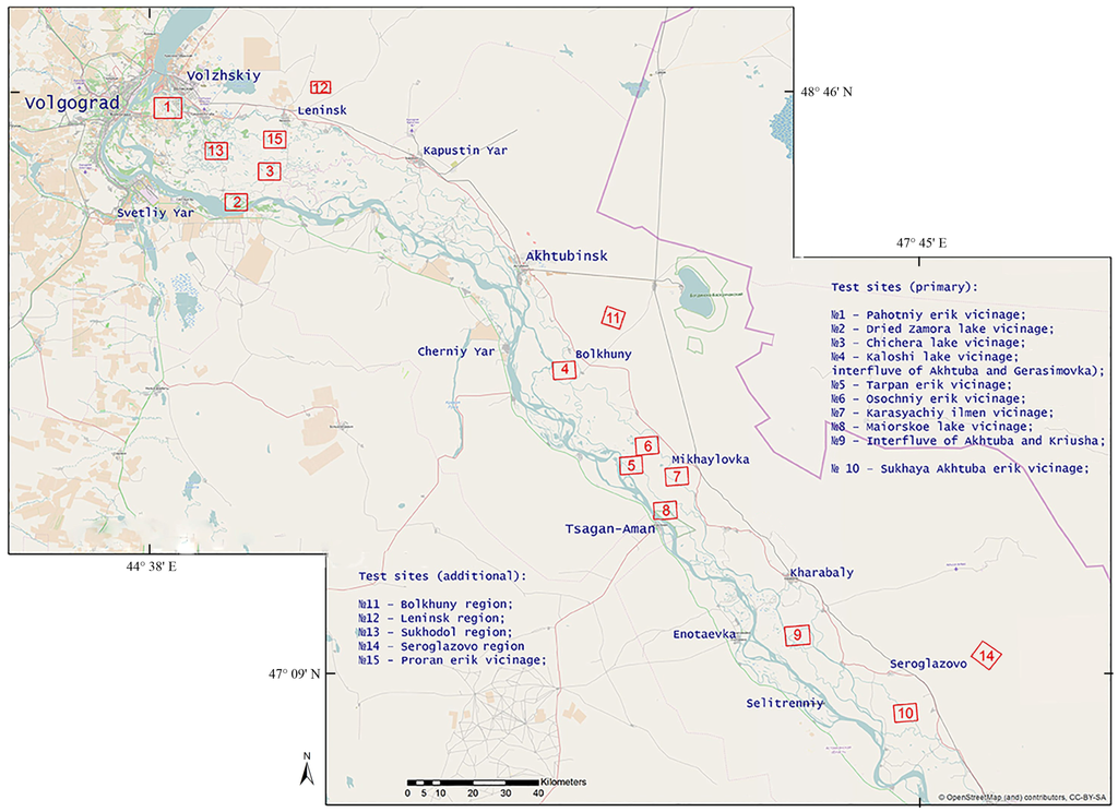 The Volga-Akhtuba floodplain extends for more than 400 km along the Volga River, from the city of Volgograd and southeast to the Volga delta and the Caspian Sea. Its unique wetland ecosystems are the foundation of local economies, including electricity generation, agriculture, livestock production, fishery, chemical industry, recreational tourism, and so forth. Surrounded by desert and dry steppes, the floodplain is a huge oasis of human activity within three administrative territories of Russia: the Volgograd region, the Astrakhan region and the Republic of Kalmykia. Ecosystem monitoring along with the regulation of the hydrological regime in the area allows understanding, predicting and mitigating various natural and human impacts on ecosystems, particularly those associated with hydropower dam water discharge. These actions are crucial to preserving the development of the region [1]. In recent years, accelerating desertification processes have been observed in the Volga-Akhtuba floodplain [2]. Local wetlands are extremely sensitive to the hydrological regime in the arid environment, and their monitoring is essential for biodiversity conservation [3,4,5,6,7,8,9,10,11]. Because of the enormous size of the area under study (over ), remote sensing techniques represent the only source of an unbiased and balanced broad view of the problem. In this framework, the vegetation activity is not only a significant factor in the local economy (e.g., in agriculture, livestock production), but it is also a good indicator of the integral condition of ecosystems [12,13,14,15,16,17,18,19,20,21].