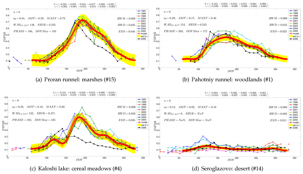 The following charts (see Figure 2) depict several comparisons between the derived model and actual FAPAR data. FAPAR data from 1997–2005 correspond to the high Volga runoff period [23]. These values served as reference information. Summarizing the interpretation of the numerical results for test sites as compared to in situ data given in Section 4, from the ecological point of view, the model-derived quantities listed above seem to represent the ecological traits of particular land sites. Given the consistency between the model, actual FAPAR data and vegetation activity observed in the field, use of the model as a reference for analyzing and interpreting deviations from the model is reasonable. The complete set of charts and numerical results for all 15 test sites is given in Figures S1, S2 and S3 and Table S1 in supplementary materials.