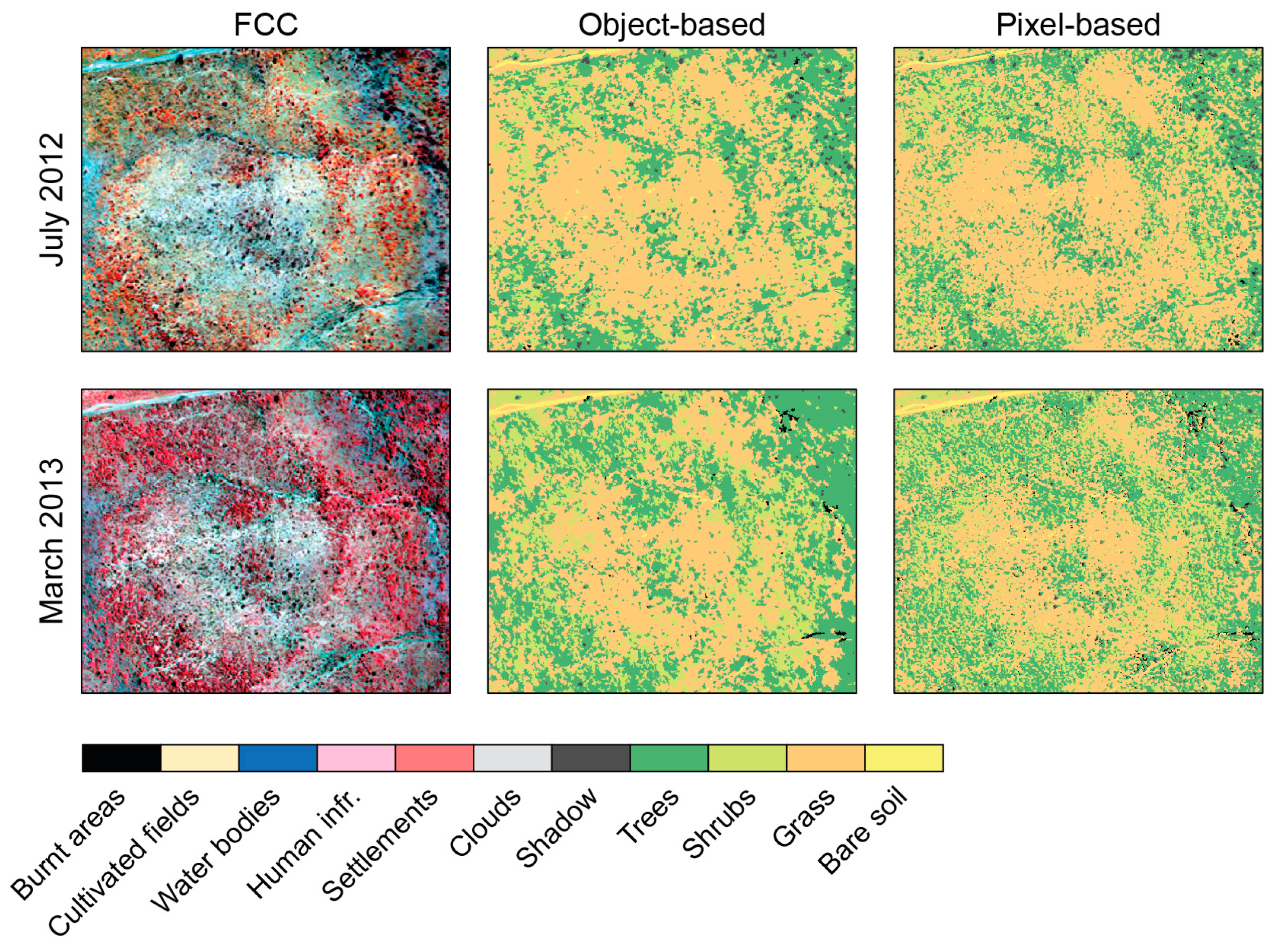 Land cover map for the July 2012 and March 2013 images, made using Object-Based Image Analysis (OBIA) and the random forests (RF) classifier.
