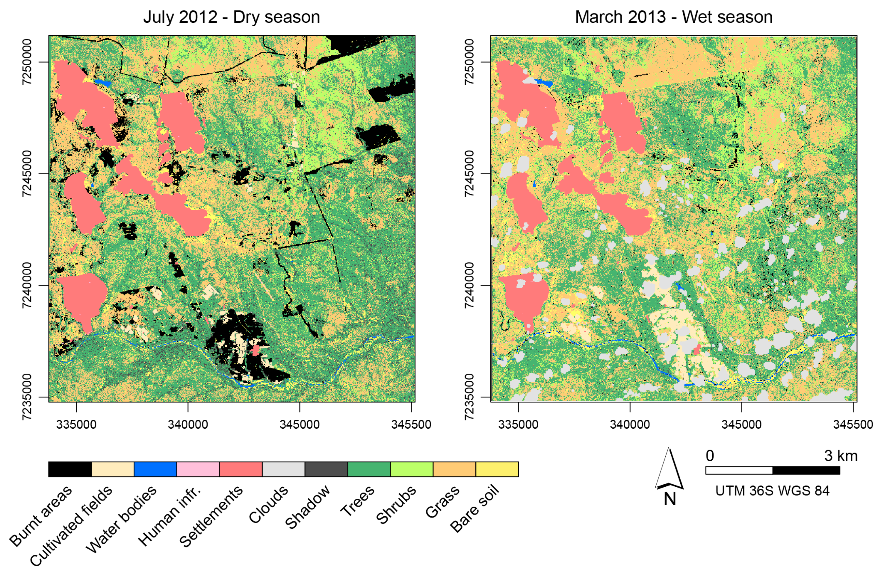 Most individual land cover classes had higher user and producer accuracy in the wet season classification compared to the dry season. However, there were also differences according to the classification approach. Pixel-based methods exhibited lower user and producer accuracies during the wet season for about 37% of the cases irrespective of the algorithm used. Poorer performances for the wet season with pixel-based approach were observed mostly for the burnt class (up to 35% decrease of producer accuracy), and for the class tree (up to 13% decrease of producer accuracy).
