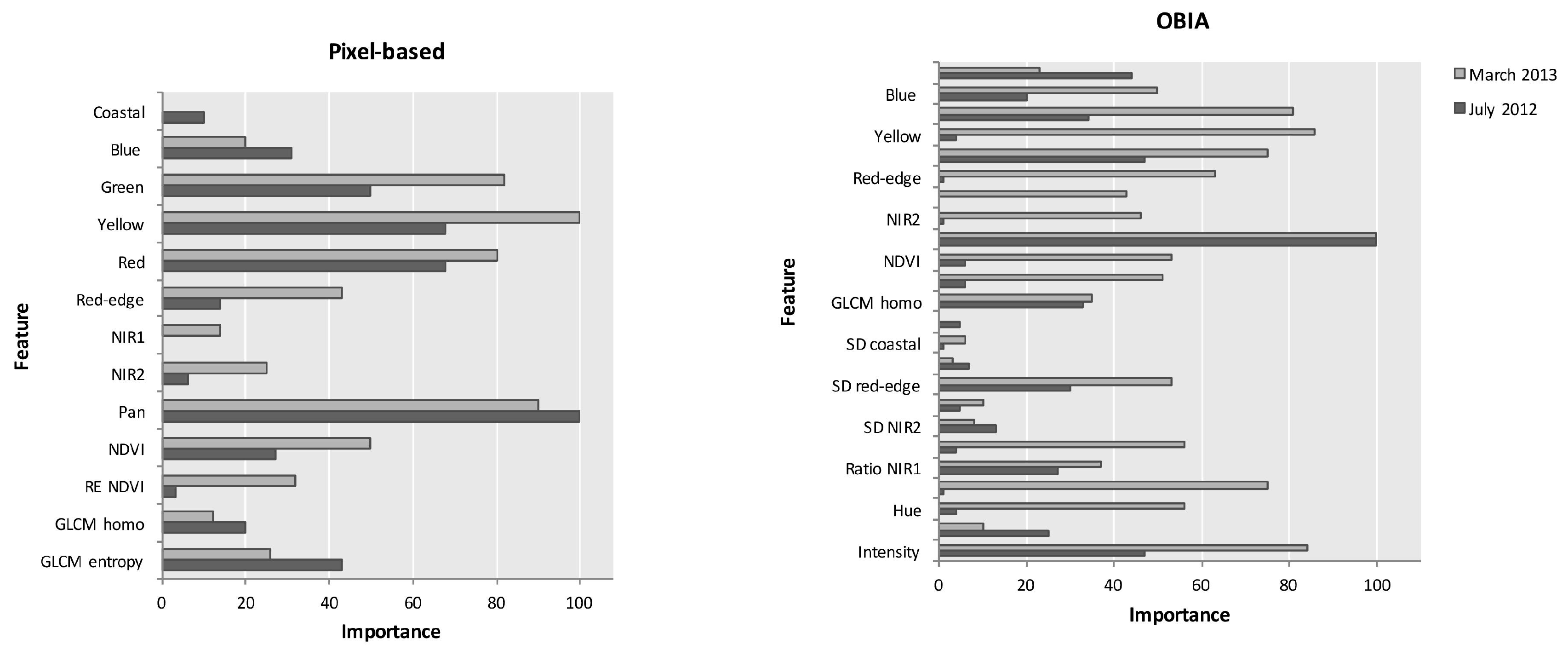 Plots of features importance using Random Forest classifier with pixel- and object-based approach applied to June 2012 and March 2013 images.