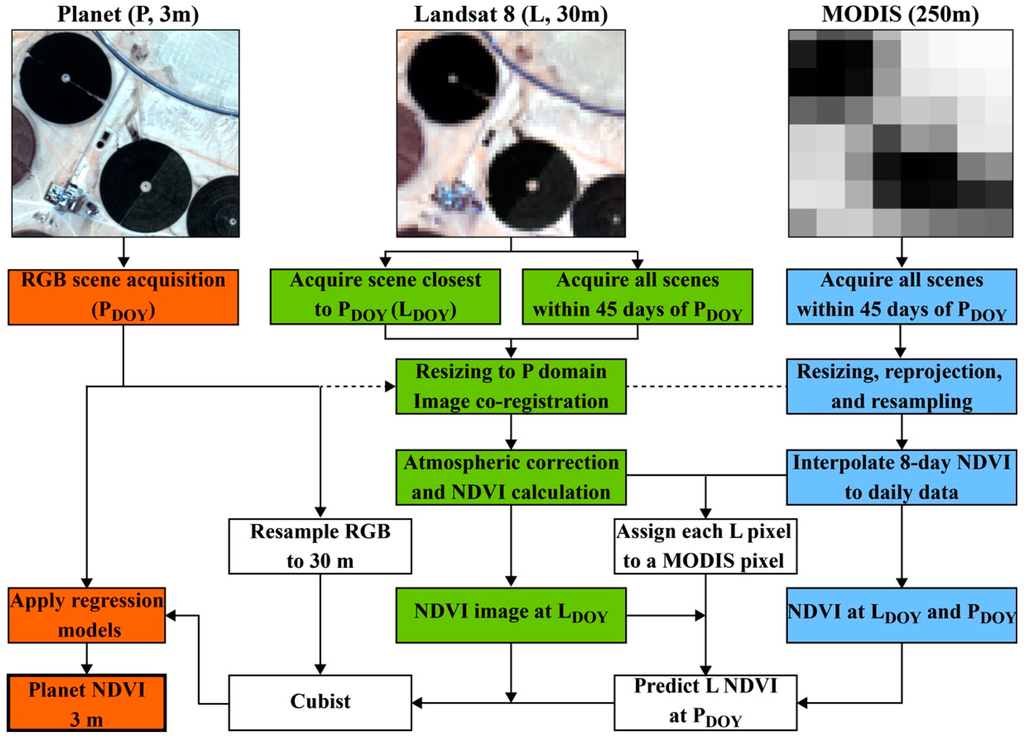 A key objective of the current study is to exploit the high radiometric quality and near-infrared imaging capability of Landsat-8 to maximize the utility of Planet’s RGB time series imagery for agricultural applications. The capacity of the RGB to reproduce insights provided by traditional Landsat NDVI dynamics was investigated using a data mining approach. An accurate translation of the RGB imagery into maps of Landsat consistent NDVI is seen as a particularly useful step given the recognition of NDVI as a key metric for the state and functioning of vegetation. To do this, associations between the NDVI and RGB data were established on a scene-specific basis using atmospherically corrected Landsat NDVI, in an attempt to minimize cross-sensor inconsistencies (i.e., resulting from many individual Dove cameras) and time and space varying contaminations from atmospheric influences. Coarser resolution (i.e., 250 m) NDVI from the Moderate Resolution Imaging Spectroradiometer (MODIS) were also integrated into the downscaling framework to account for surface variations in NDVI occurring between the Planet and Landsat scene acquisitions. An important objective was to develop an operational framework, building upon an automated processing stream and generic techniques that are capable of translating dense time-series of raw RGB imagery into Landsat consistent and atmospherically corrected estimates of NDVI at 3–5 m resolution.