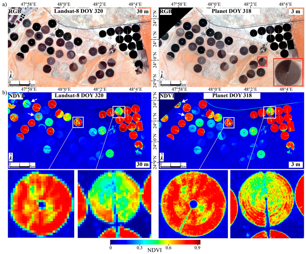 In the ideal scenario, a clear-sky Landsat-8 image would be available within a few days of the Planet acquisition. In this case, changes in surface cover conditions (i.e., NDVI) between acquisitions will typically be minor and the training of the rule-based regression models will be based on observed NDVI spatial dynamics. Figure 2a shows true color (i.e., RGB) images over the farm from Landsat-8 and Planet acquired two days apart. As can be seen, the spatial features are generally similar, with dense vegetation pivots appearing dark (due to radiation absorption by chlorophyll pigments) and the surrounding highly reflective desert soil appearing bright. Some of the sparsely vegetated pivots also appear in darker colors, which is a result of the active irrigation. In fact, the position of the center pivot irrigation arm and the clockwise rotation of the center pivot can be observed, with darker shades trailing and brighter shades leading the irrigation arm (Figure 2a insert).