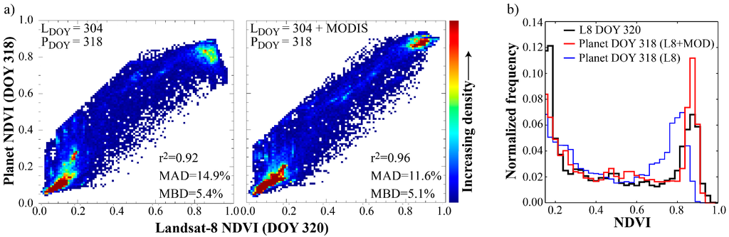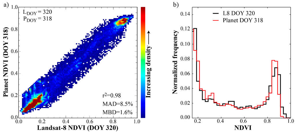 (a) Density scatter plot intercomparing Landsat-8 and Planet NDVI. The Planet NDVI at DOY 318 was estimated from multi-variate regression models using Landsat NDVI from DOY 320 as training data; (b) Normalized frequency distributions of the Landsat-8 and Planet NDVI using DOY 320 as the Landsat training base. Note that the Planet data have been resampled to 30 m resolution to facilitate a scale consistent intercomparison and statistic evaluation.