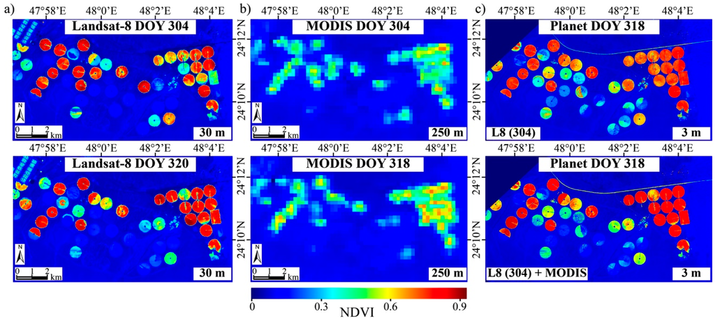 When the Planet and Landsat-8 acquisitions are further apart, changes in surface cover conditions can be significant, which will impact the utility of the Landsat-only processing stream in reproducing the NDVI dynamics on PDOY. To examine such a scenario, NDVI at PDOY (DOY 318) was predicted using Landsat NDVI training data from DOY 304. As seen in Figure 4a, the majority of the pivots on the eastern half of the farm experience a significant green up between DOY 304 and 320. This is reflected in the Planet NDVI predictions (Figure 4c, top plot), which underestimate the actual NDVI magnitudes, particularly over those areas (Figure 4a, bottom plot). Improved NDVI predictability is achieved when the day-specific MODIS NDVI imagery (Figure 4b) is used to inform upon the Landsat-scale changes in NDVI occurring between DOY 304 and PDOY. In that case, the NDVI magnitudes are more accurately reproduced and the spatial features in the predicted NDVI (Figure 4c, bottom plot) are generally consistent with the observed patterns in the Landsat NDVI on DOY 320 (Figure 4a, bottom plot).