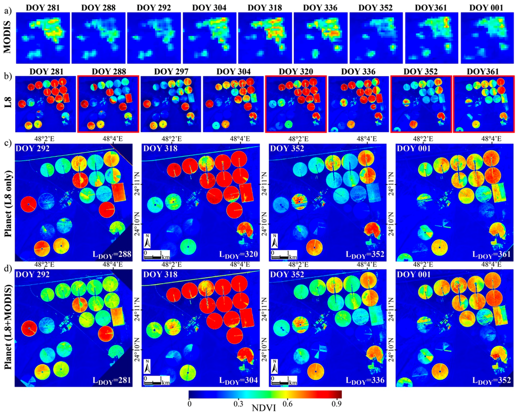 Figure 6 displays spatio-temporal features in (a) MODIS, (b) Landsat-8 and (c,d) Planet NDVI over the eastern part of the farm during the period of study, and showcases the two procedures (Landsat only or combination of Landsat and MODIS) for generating time-series of Planet NDVI. In all cases, each Cubist simulation is independent, with resultant rules specific to the given Planet scene. In Figure 6c, a near-coincident Landsat NDVI image was used to train the rule-based NDVI predictive models, whereas a Landsat scene further away from PDOY together with MODIS NDVI imagery from LDOY and PDOY were used to produce the Planet NDVI maps in Figure 6d.