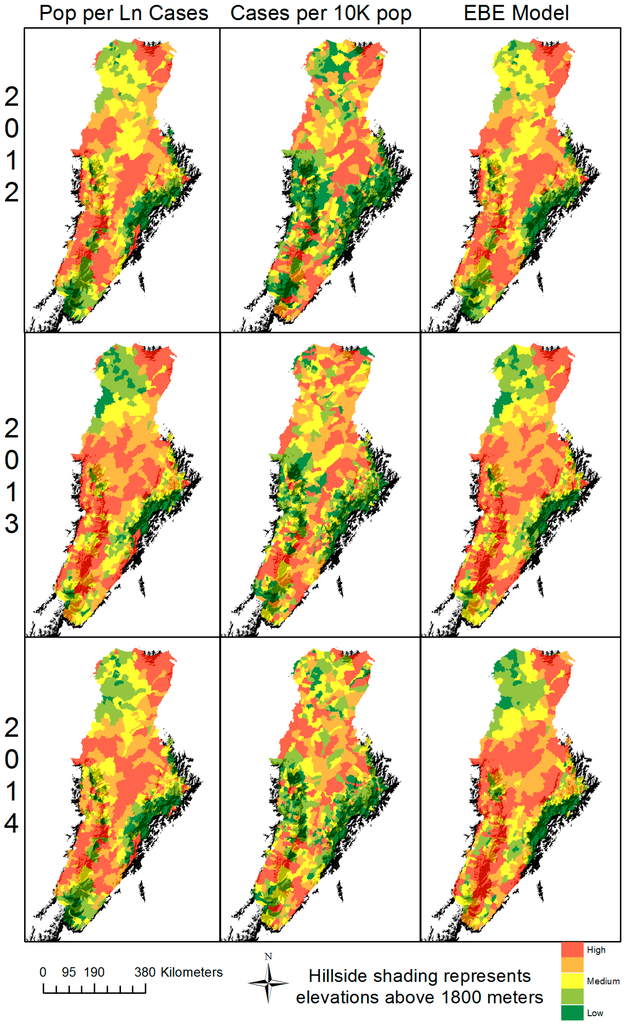 The SPSS regression variable output from Stage 3 was mapped by municipality to demonstrate the geographical distribution of the project’s results, following the procedures of previous vulnerability studies [34,62,63,64,69]. Figure 4 demonstrates the visual comparison of the population density and EBE models to the distribution of reported DF cases per 10,000. The population and population density models were similar in component and mapped results. All three of the models follow a similar spatial pattern across all years by indicating low risk in higher elevated municipalities and increased risk in the more moderate temperature valleys, which coincide with areas more suitable for vector survival [4,18,19,28]. The maps suggest the population based models have a propensity to indicate higher risk in more densely populated areas, even if they exist above the elevation limit of the mosquito, such as Bogota. The EBE model does not indicate as high of a risk for densely populated areas, even those within the mosquito’s habitable elevation. Therefore, it is anticipated that the population models added weight to municipalities with larger urban areas, potentially due to the inclusion of the population independent variable, which the EBE model did not have. These mapped results show similar distribution of the vector count, supporting the models were able to appropriately identify the contributing independent variables, for example, the temperature range and elevation.