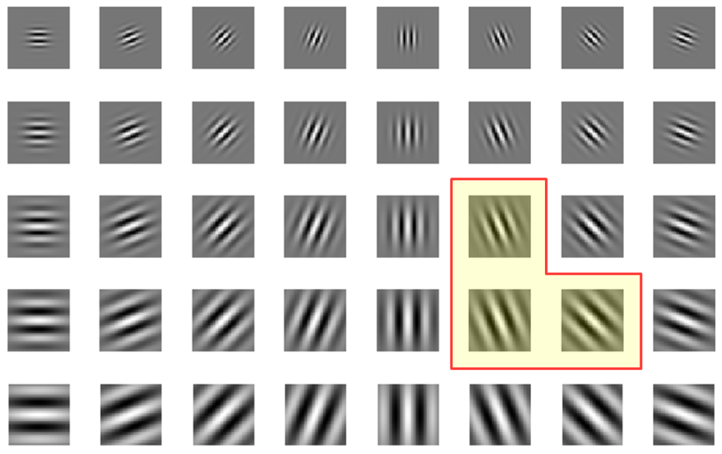 Real parts of the Gabor filter bank used in the experiments in this paper according to the different orientations and scales. Highlighted are the filters giving the highest contribution to the detection to be described in next section.