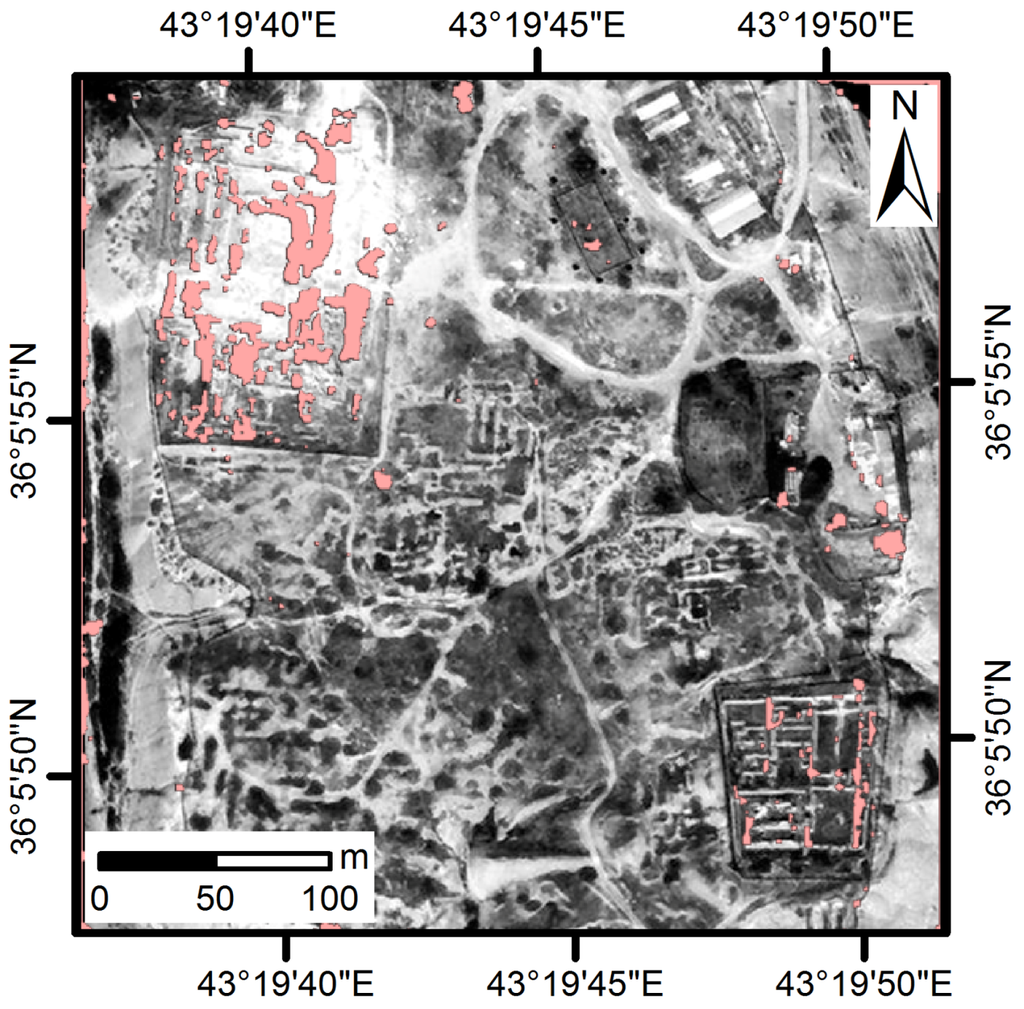 The pre- and post-destruction images are reported in Figure 14. The Northwest Palace (visibly damaged in the image acquired at time ) lies in the northwestern part of the image, while the Temple of Nabu is located in the southeast.