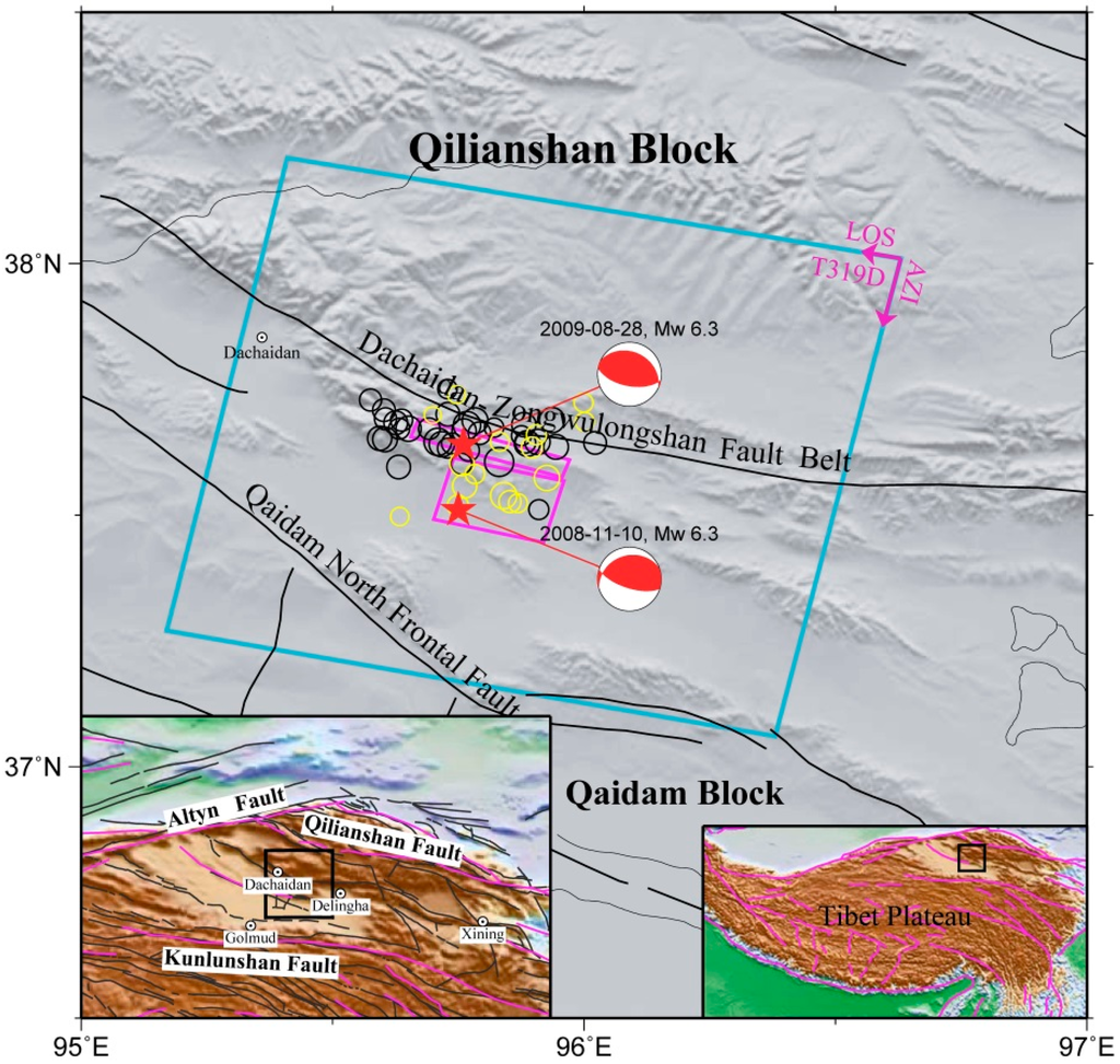 Tectonics associated with the 2009 Mw 6.3 DCD earthquake. The bottom-left and bottom-right insets show the location of the main figure, respectively. The light blue rectangle is the spatial extent of the Envisat Advanced Synthetic Aperture Radar (ASAR) descending Track 319 images, with AZI and LOS referring to satellite azimuth and look directions. The focal mechanisms of the 2008 and 2009 events are from United States Geological Survey (USGS) [4]. The two purple rectangles are the surface projections of the main fault rupturing zones during the 2008 and 2009 events [3,21]. The black and yellow hollow circles are the aftershocks of the 2008 and 2009 events, respectively [4]. The purple and black lines are the active faults from Peltzer and Saucier [24] and Deng et al. [5], respectively. (Note that the references here correspond to those in the original manuscript).