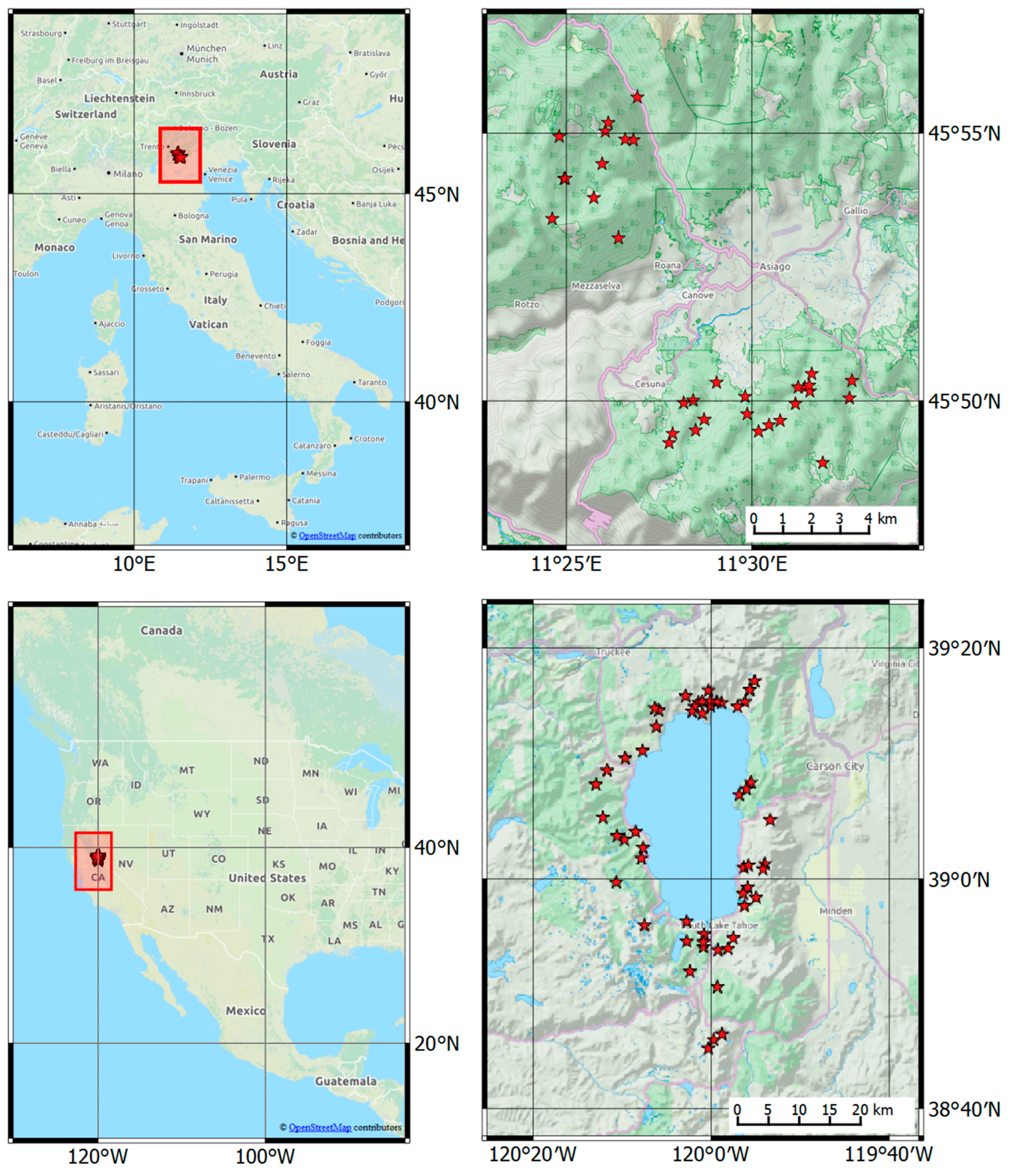 The Asiago (top) and Tahoe (bottom) study sites. On the left side, the geographic location of the areas are illustrated; on the right side a zoom over the area is shown, with red star symbols indicating field plots.