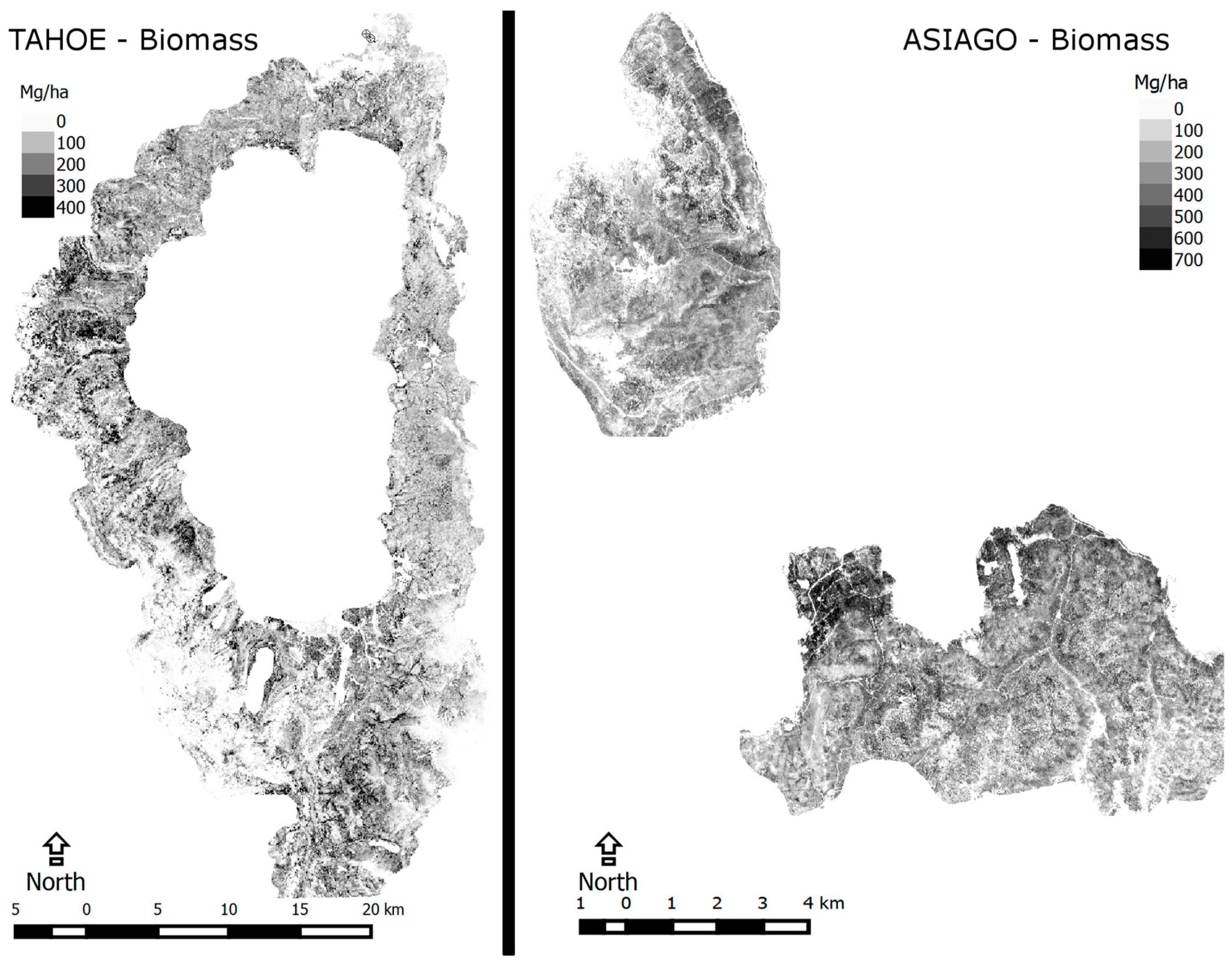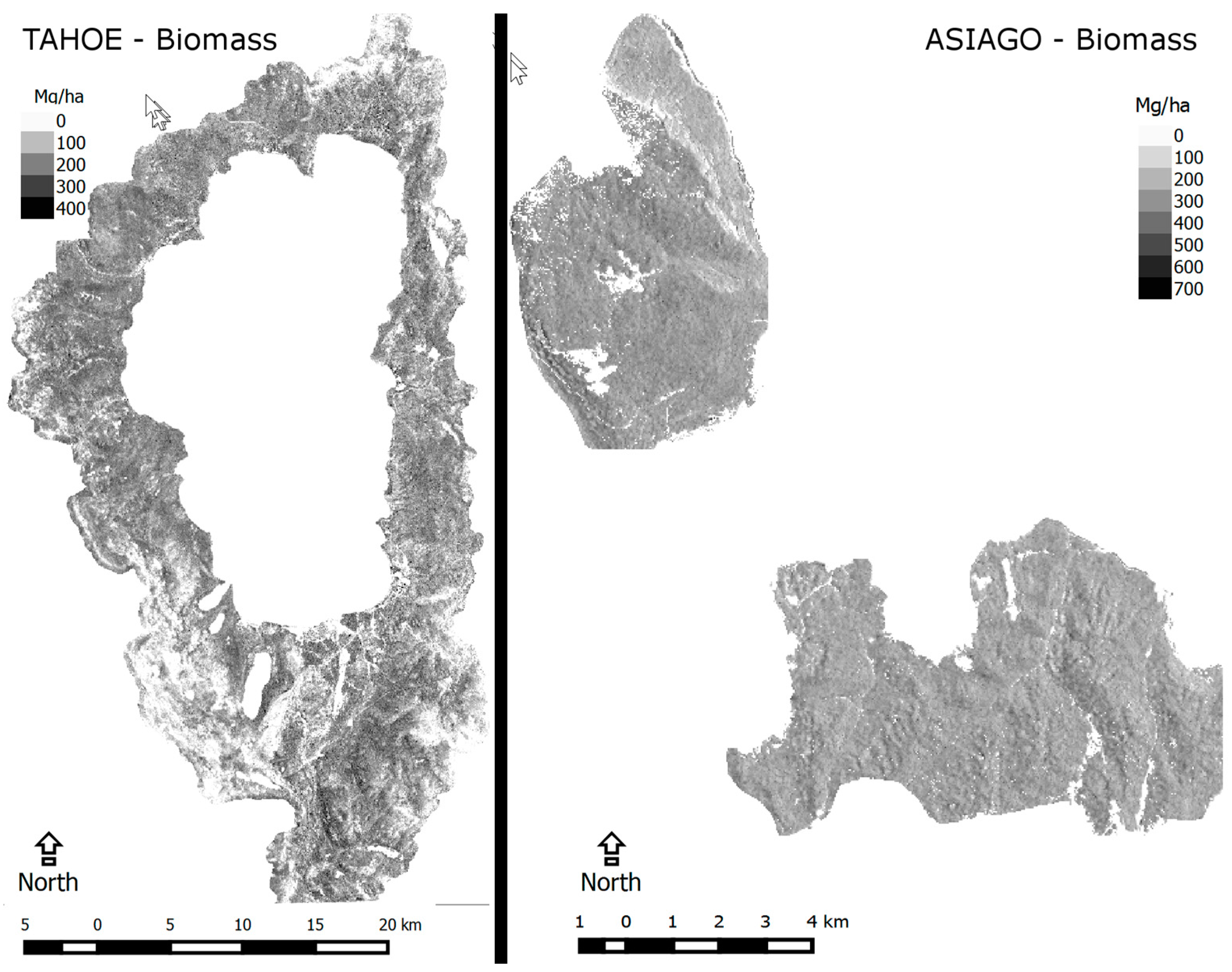 Lidar-derived AGB map for Tahoe area (left) and Asiago area (right).
