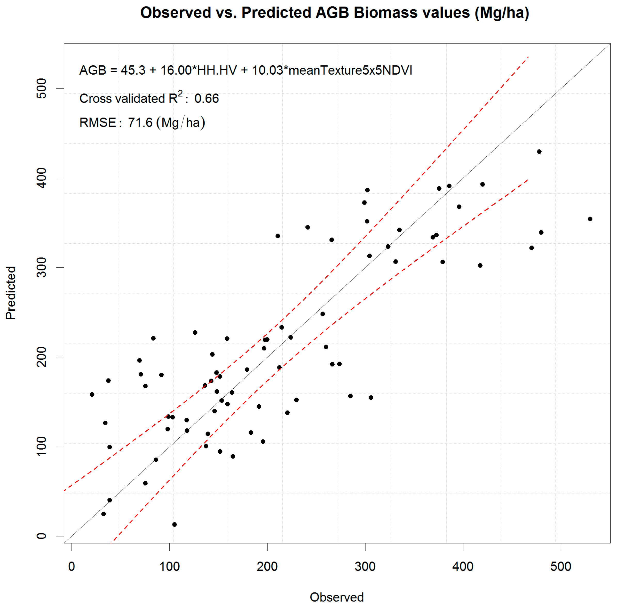 Among test results, we considered as the best the one produced by the fourth (d) test, having the same results of (c) but being based on much reduced number of input data; selected inputs were HH + HV (dB sum) and the 5 × 5 mean NDVI texture, with the related equation and scatterplot of the predicted vs. observed AGB values presented in Figure 3.