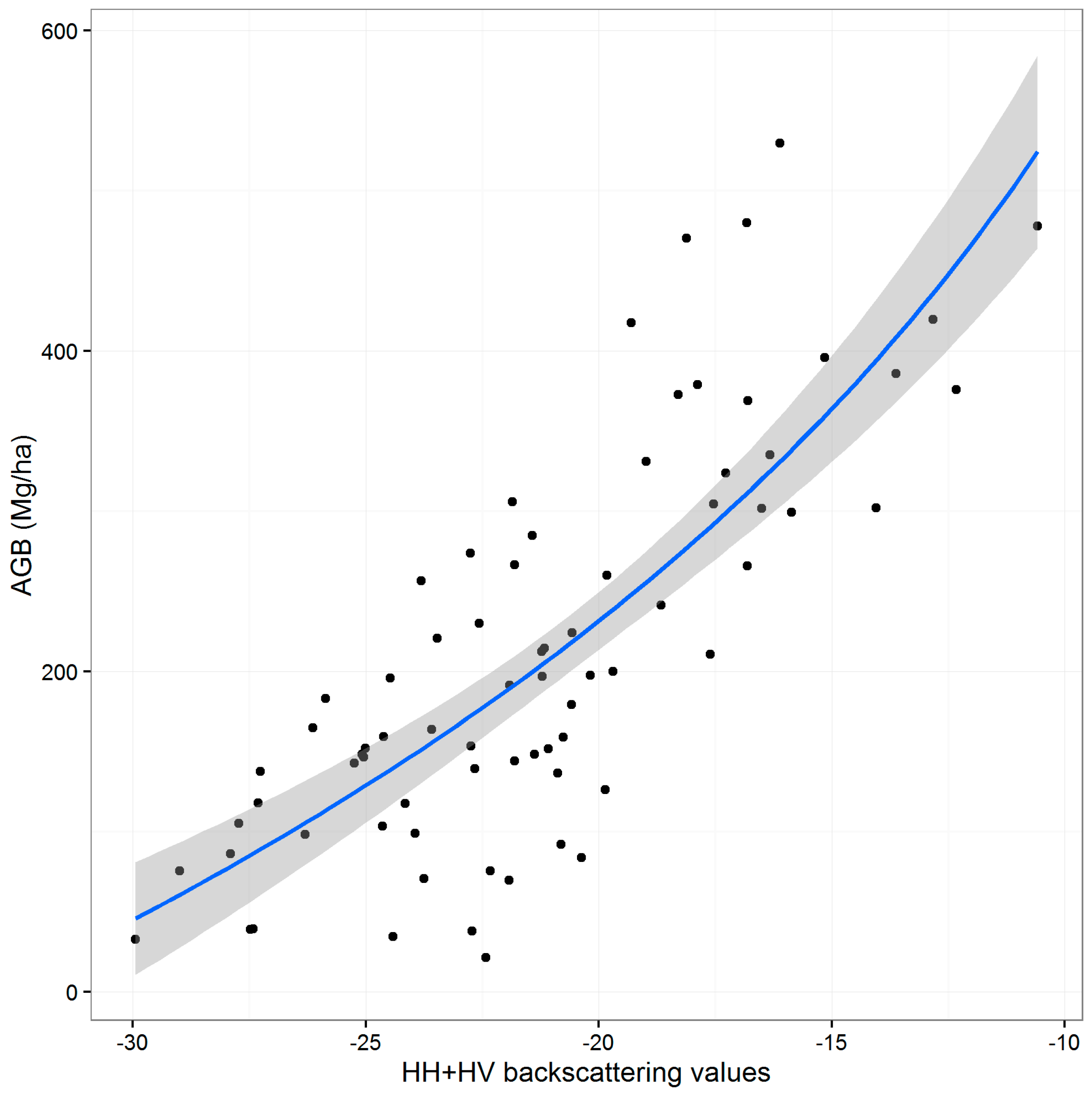 For the other SAR and NDVI combined datasets, the inputs for the different tests were selected via stepwise procedure. Cross-validated accuracies for each test allowed selection of the best model for AGB estimation; results are presented in Table 1. In the first (a) test based on SAR data, we used as stepwise regression inputs the statistics derived from HH and HV channels averaged at plot level; the stepwise procedure selected the sum of HH and HV backscattering values, and the linear regression R2 resulted equal to 0.59 with RMSE equal to 78.76 Mg/ha with LOO validation, and 0.59 and 78.33 Mg/ha with 10-fold validation.
