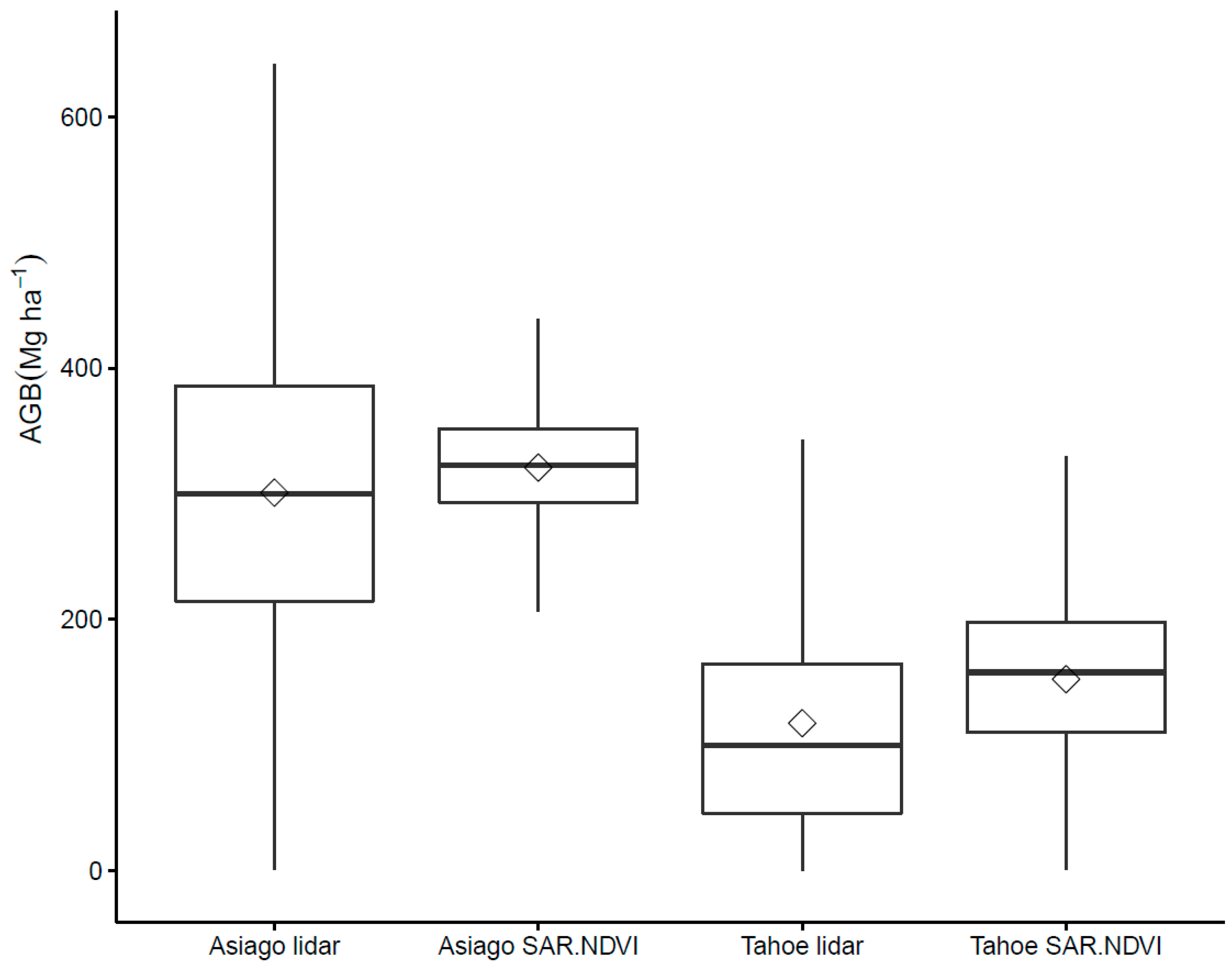 Distribution of AGB values in SAR plus NDVI and lidar-based maps. Boxes represent upper (75%) and lower (25%) quartiles; vertical segments out of boxes are minimum and maximum values; boxes are divided by the median; diamonds represent the mean.