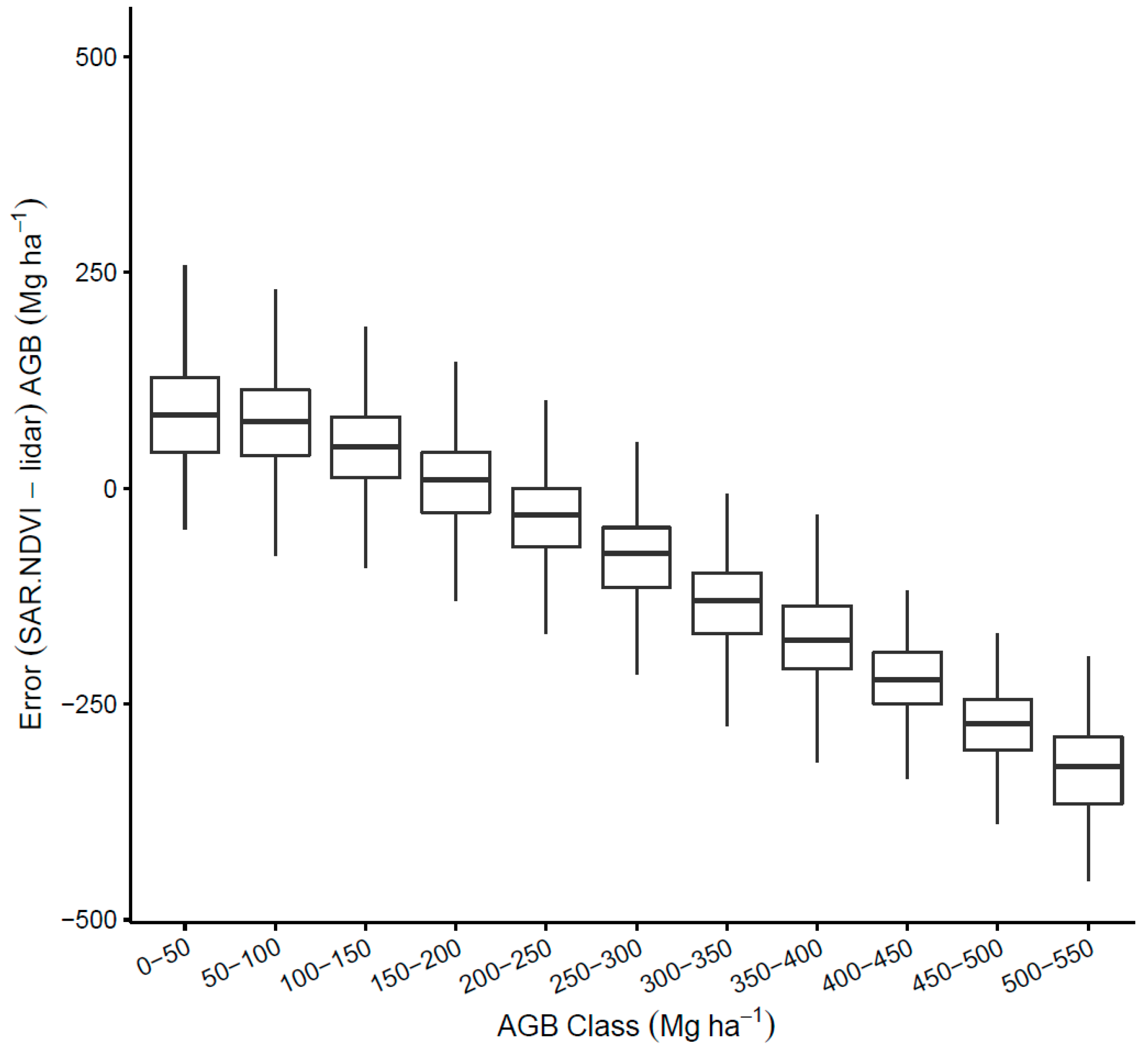 Difference per AGB intervals of the SAR + NDVI map with respect to lidar map. Boxes represent upper (75%) and lower (25%) quartiles; vertical segments out of boxes are minimum and maximum values; boxes are divided by the median.