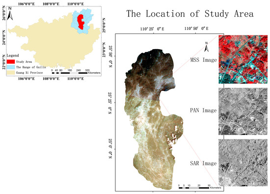 The study area is located within the region 24°38′–25°54′N, 110°09′–110°46′E, covering an estimated area of 5.96 × 103 km2 (Figure 1). The Li River flows from Cat Mountain, located on the border between Xingan and Lingchuan counties, through Xingan and Lingchuan counties, the city of Guilin, and Yangshuo County. The length of the imaged area is 188 km. The area of specific interest in this study is located in the middle reaches of the Li River, around Guilin, Lingchuan County and the surrounding areas.