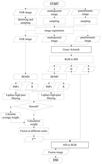 A synthetic aperture radar (SAR) sensor is a type of active sensor that makes earth observation possible, regardless of weather conditions. It is sensitive to the geometric features of targets, and it can provide a radar image containing information on surface roughness, object shape, orientation, and moisture content [1]. However, SAR imagery is usually difficult to interpret because of certain factors (e.g., foreshortening, range and azimuth shift, layover, radiometric variation, and speckle noise) [2]. Panchromatic and multispectral imagery have high spatial resolution and can, respectively, reflect edge information [3] and spectral information of different objects. Maximizing visual performance by combining the characteristics of SAR and optical sensors will benefit image processing tasks, such as object identification and regional change detection [4,5,6]. However, because of the significant differences between the imaging mechanisms of SAR and optical sensors, the properties of SAR, multispectral, and panchromatic images are different for the same surface features of the same target. Traditional fusion methods, such as intensity–hue–saturation (IHS) and principal component analysis are not adequately effective, because they do not consider the differences in mechanism and spectrum characteristics of SAR, multispectral, and panchromatic images. Recently, the multiscale decomposition method (MSD) has been recognized as useful for image fusion. Based on this finding, various MSD-based fusion methods have been proposed for the fusion of SAR and panchromatic images [7,8,9]. The discrete wavelet transform (DWT) fusion method generally produces good results with computational efficiency; however, this method is not shift-invariant because of the subsampling done during processing. Fusion with contourlets, which provides asymptotic optimal representation of contours, has been used in the field of image fusion with successful results. However, contourlet methods also lack shift-invariance, which can result in artifacts along edges [10]. Wavelet decomposition, similar to pyramid methods, depends on a predefined filter or wavelet function, which greatly affects the quality of the fused image. The empirical mode decomposition (EMD) technique, formulated by Huang [11], is an adaptive decomposition method that can decompose any complicated signal into multiple scales of spatial frequencies, called intrinsic mode functions (IMFs). As a time domain analysis technique, EMD is different from Fourier methods and the DWT method, and it can be adapted for the analysis of nonlinear and nonstationary datasets [12,13,14]. The bidimensional empirical mode decomposition (BEMD) method has been used since 2003 [15]. It is an extension of the EMD technique that has been applied to image fusion [16]. In this study, we applied the BEMD method to SAR, panchromatic, and multispectral images. Achieving the fusion of SAR, multispectral, and panchromatic imagery simultaneously was the objective of this study.
