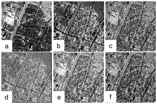 Visual inspection shows that the fused images contain more information than the original single images. Building edges, lines, and corners (Figure 3c,e,f) are much sharper than in the original SAR image. This implies that fusion by the DWT, NSCT, à-trous and BEMD methods improves the spatial quality of SAR images. The fused images (Figure 3c–f) preserve the information of the SAR image well, e.g., the highlighted object information. Thus, the fused images (Figure 3c–f) fully combine the complementary and supplementary information of the original images. Compared with Figure 3c–e, the image obtained by the proposed method contains more information.