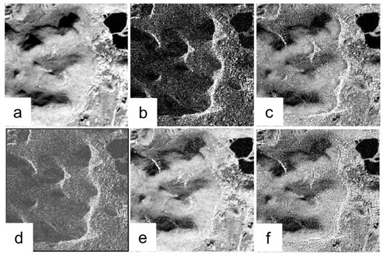 Original SAR and panchromatic images and fused images based on different fusion methods: (a) panchromatic image; (b) SAR image; (c) fused image based on DWT method; (d) fused image based on the à-trous method; (e) fused image based on NSCT; and (f) fused image based on the proposed BEMD fusion method; The area is a mountain located at the northeast of LingChuan town, and the size of the images was 512 × 512 pixels.