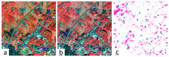 The fusion result based on Gram-Schmidt transform (a) The fusion result based on Gram-Schmidt transform, which includes two types of images (panchromatic and multispectral images). This region located in the northeast of Guilin city, covered 800 × 800 pixels, the pixel resolution is 4 m × 4 m. (b) The fusion result based on Gram-Schmidt transform, which include three types of image (panchromatic image, multispectral image and SAR image). This region located in the northeast of Guilin city, covered 800 × 800 pixels, and the pixel resolution is 4 m × 4 m. (c) The location of verification points; pink areas