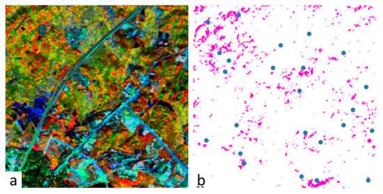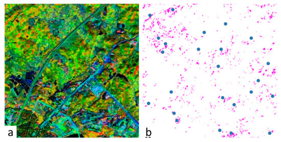 The fusion result based on BEMD (a) The fusion result based on BEMD, which includes two types of images (SAR and multispectral images). This region located in the northeast of Guilin city, covered 800 × 800 pixels, and the pixel resolution is 4m × 4 m. (b) The location of verification points; pink areas