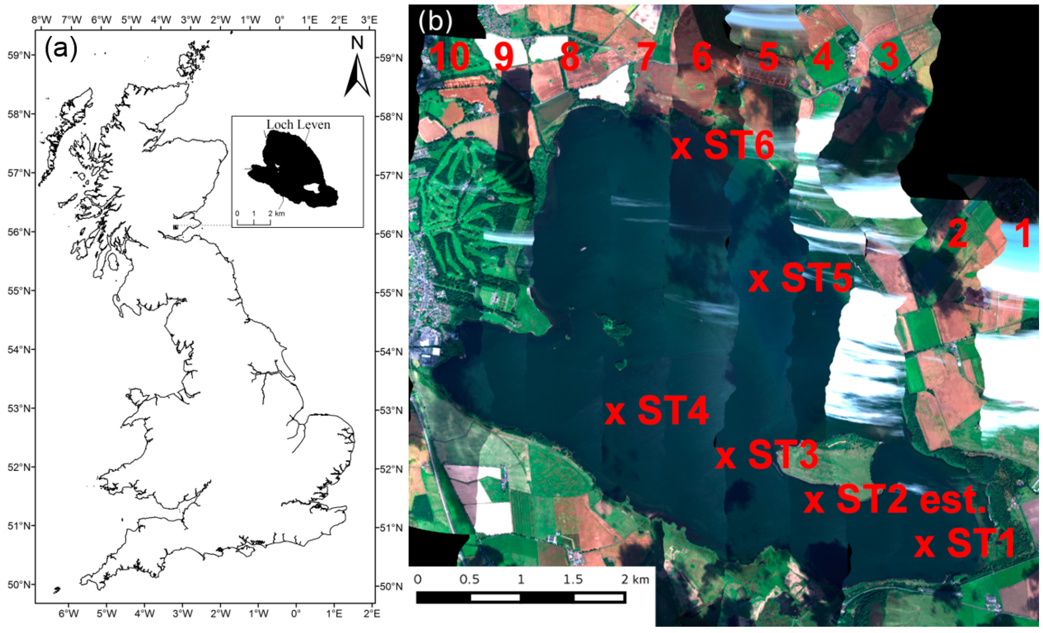 (a) map showing the location of Loch Leven within the UK; (b) Image mosaic from 10 FENIX flight lines collected during the campaign (colours are illustrative only). Locations of the in situ station measurements are marked with red crosses; the location of station ST2 is approximate.