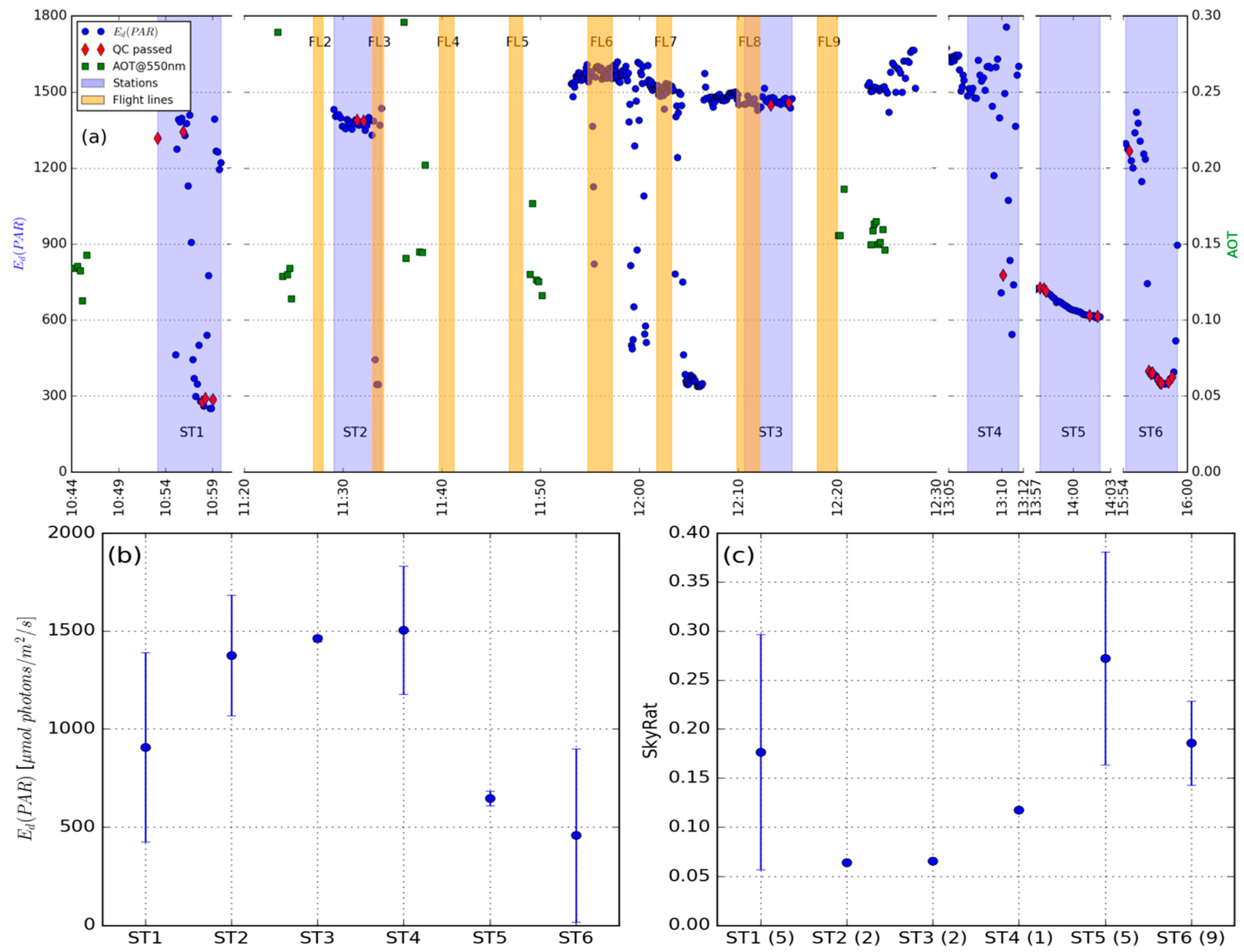 (a) In situ Ed(PAR) and AOT measurements taken during the campaign. In situ observations used for station reference spectra are marked with red diamonds. Orange shading indicates the times of airborne flight lines, and blue shading the times of station measurements; (b) Median and standard deviation of Ed(PAR) from all 30 measurements recorded at each station; (c) SkyRat based on QC passed measurements for calculation of Rrs (number of valid observations are shown in horizontal axis label). The SkyRat error bars for stations ST2-ST4 are not shown, as there were <3 valid measurements at these stations.