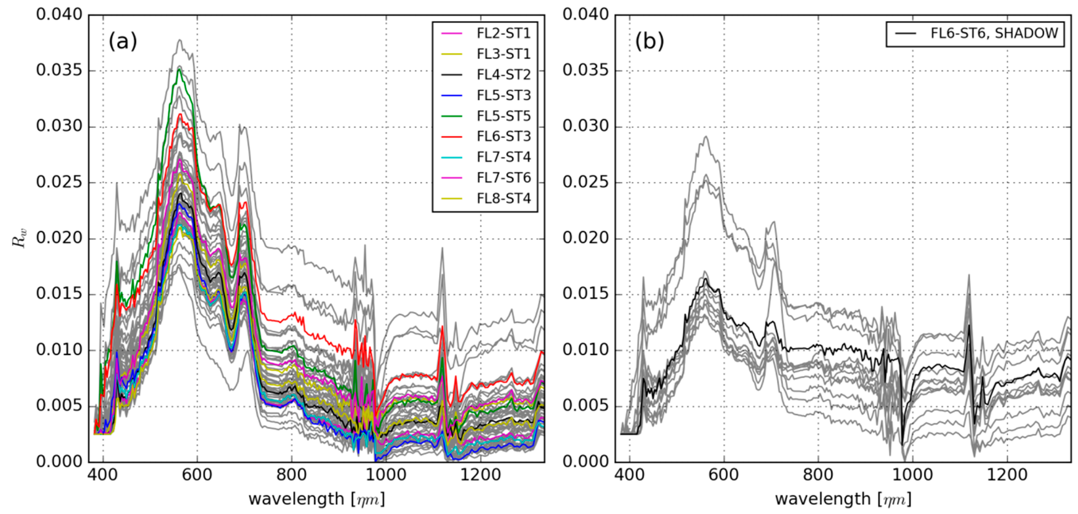 (a) Rw spectra measured from atmospherically corrected FENIX images. Spectra measured at station locations are shown in colour, grey spectra are an additional 50 measurements representing all lake areas to indicate the homogeneity of the lake; (b) Image-based Rw spectra of water measured from 21 locations under cloud shadows, the black line indicates station ST6 on image FL6. Wavelength range in the x-axis goes up to 1300 nm to indicate the non-zero reflectance in the NIR-SWIR range.